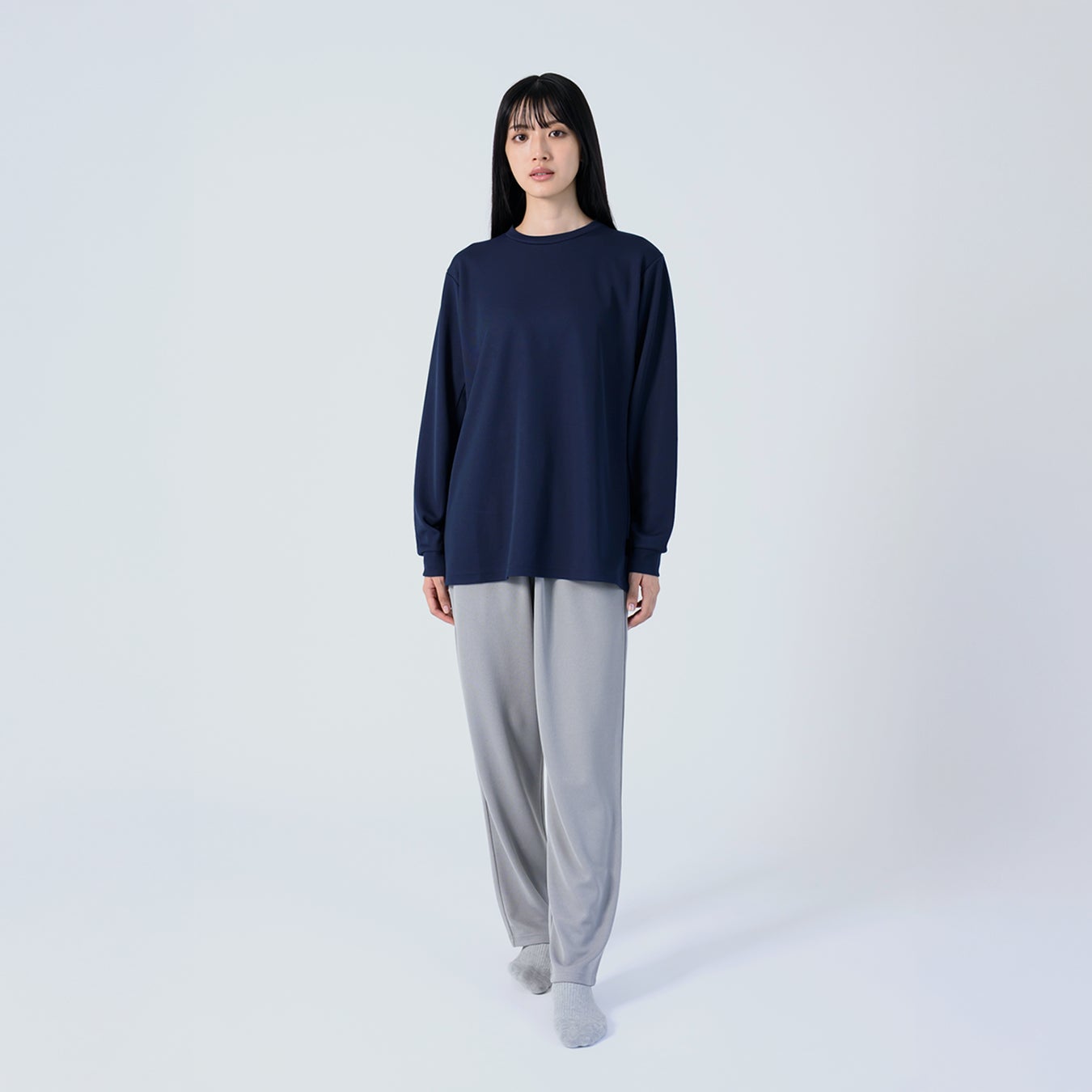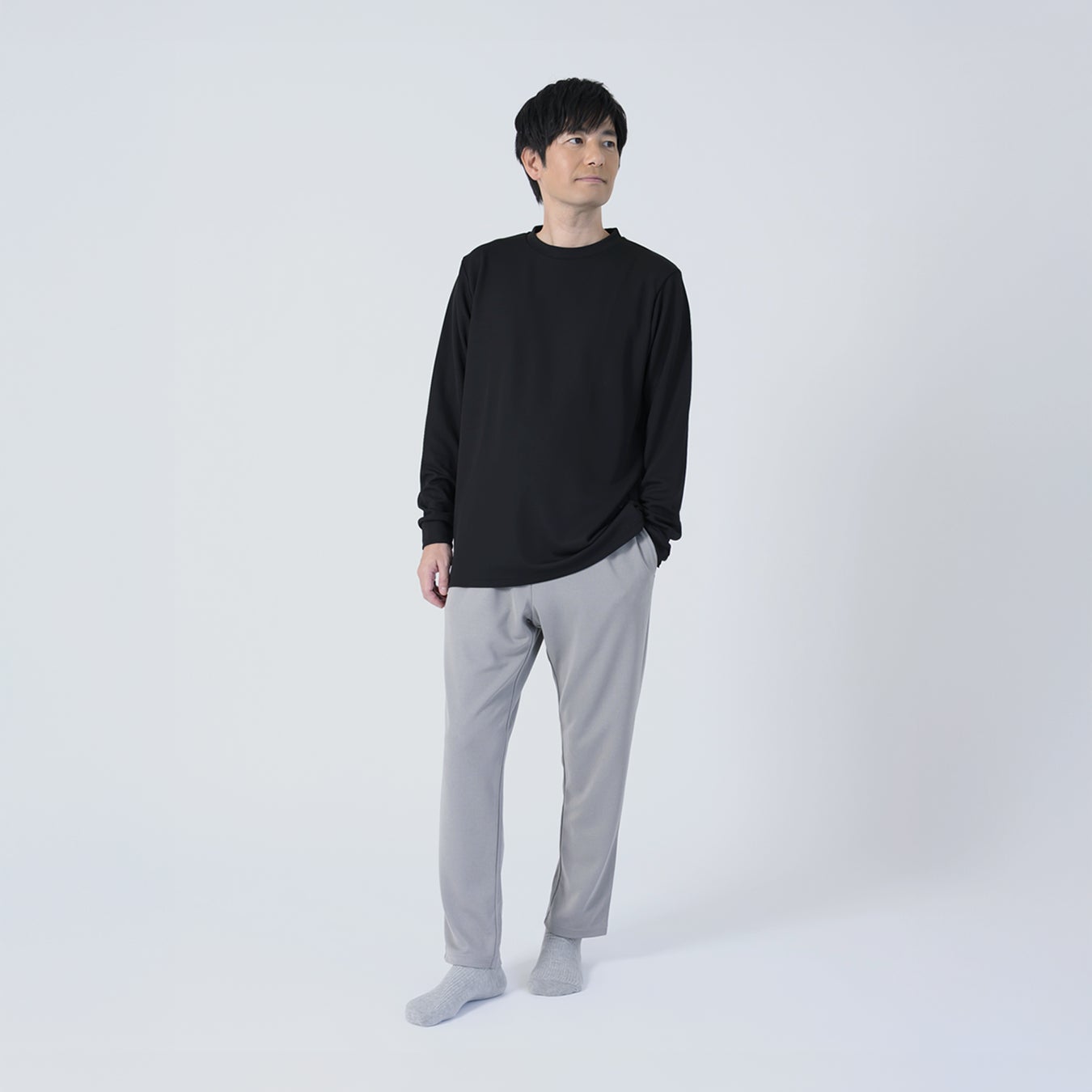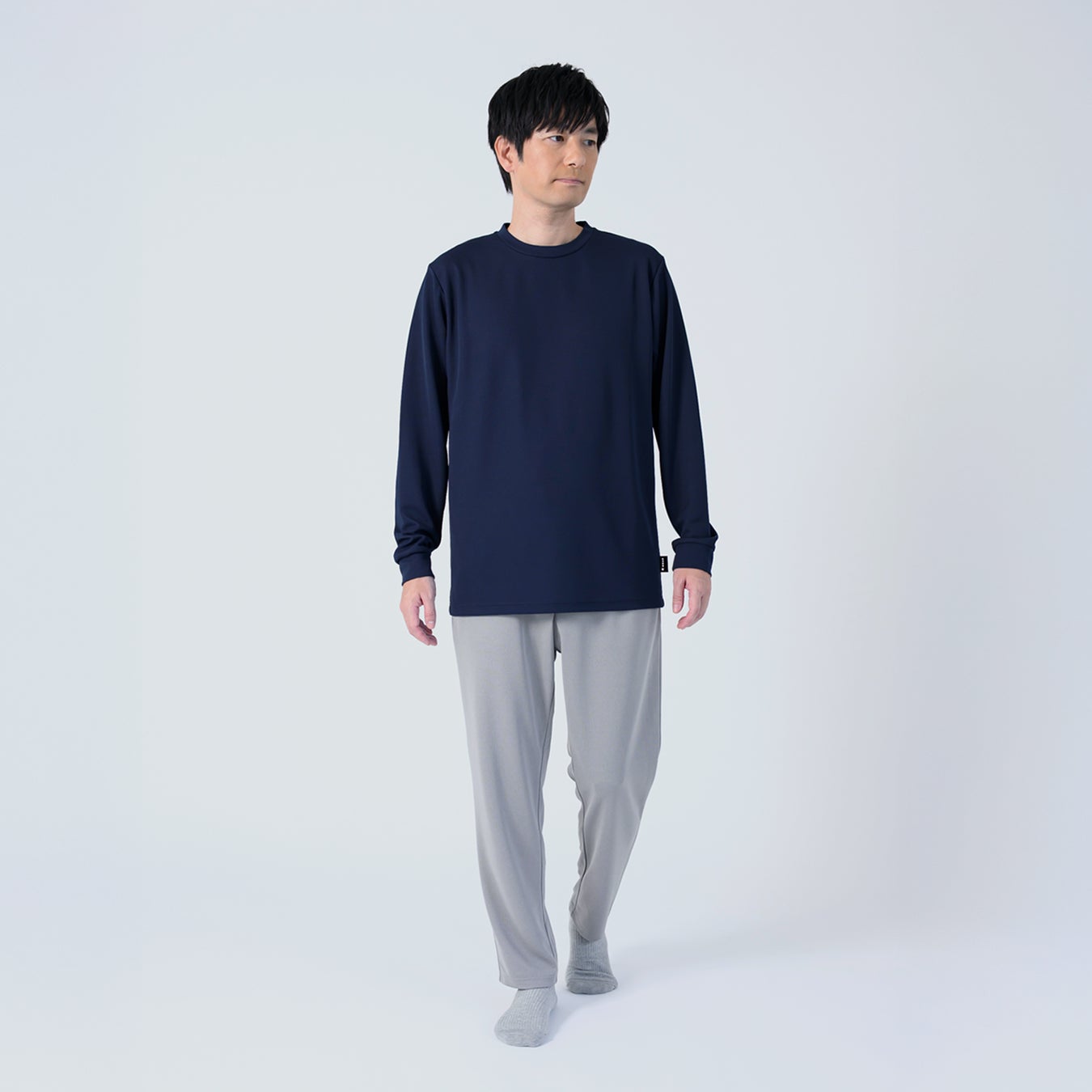 Relaxing Meshシリーズは 2枚合わせの特殊構造の生地を使用しており、保温性に優れた肌触りの良い生地を肌面に、放湿性の高いメッシュ構造を外気面に採用しました。肌寒い季節や睡眠時の体温調節にも役立ち、秋冬シーズンにおすすめの一着です。