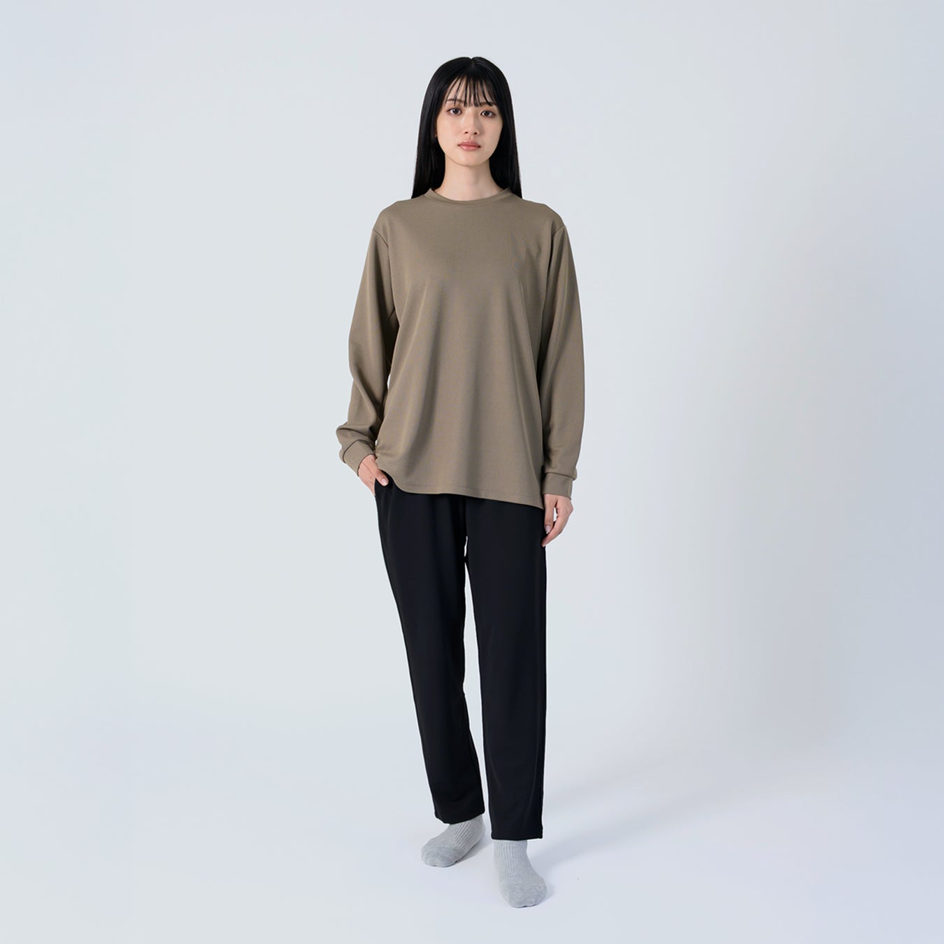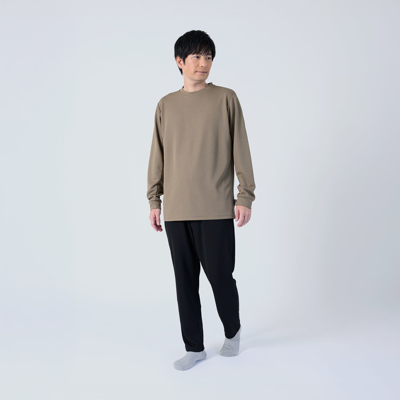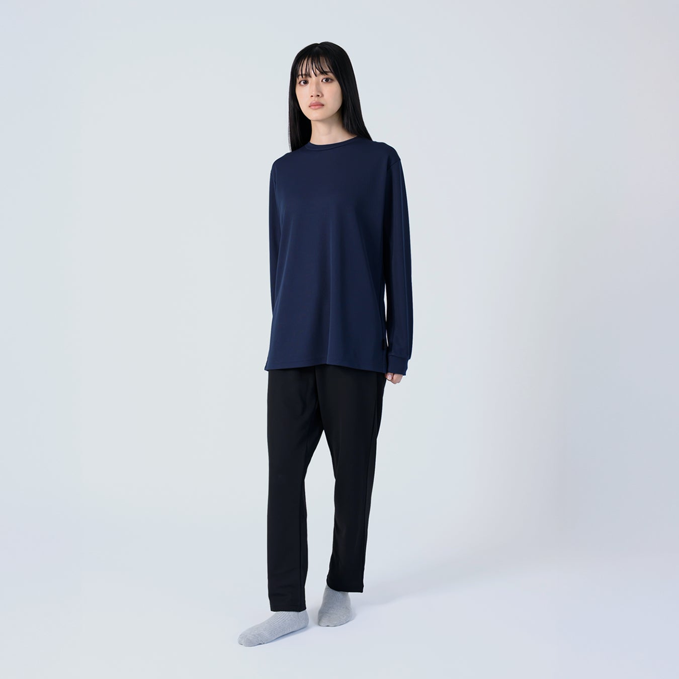 Relaxing Meshシリーズは 2枚合わせの特殊構造の生地を使用しており、保温性に優れた肌触りの良い生地を肌面に、放湿性の高いメッシュ構造を外気面に採用しました。肌寒い季節や睡眠時の体温調節にも役立ち、秋冬シーズンにおすすめの一着です。