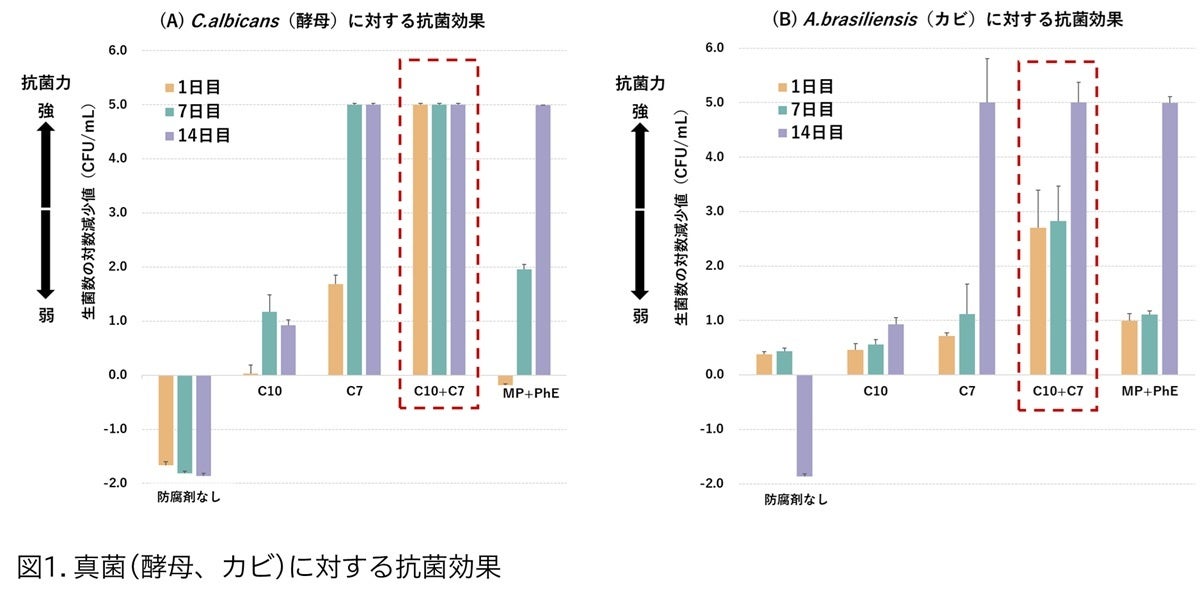 今回はこの技術をさらに進化させ、アルカンジオールの一種であるデシレングリコール(C10)と1,2-ヘプタンジオール(C7)の相乗効果により、Aspergillus brasiliensis(カビ)やCandida albicans(不完全酵母:以後酵母と略す)などの真菌に対して高い抗菌力を発揮する技術を確立しました。