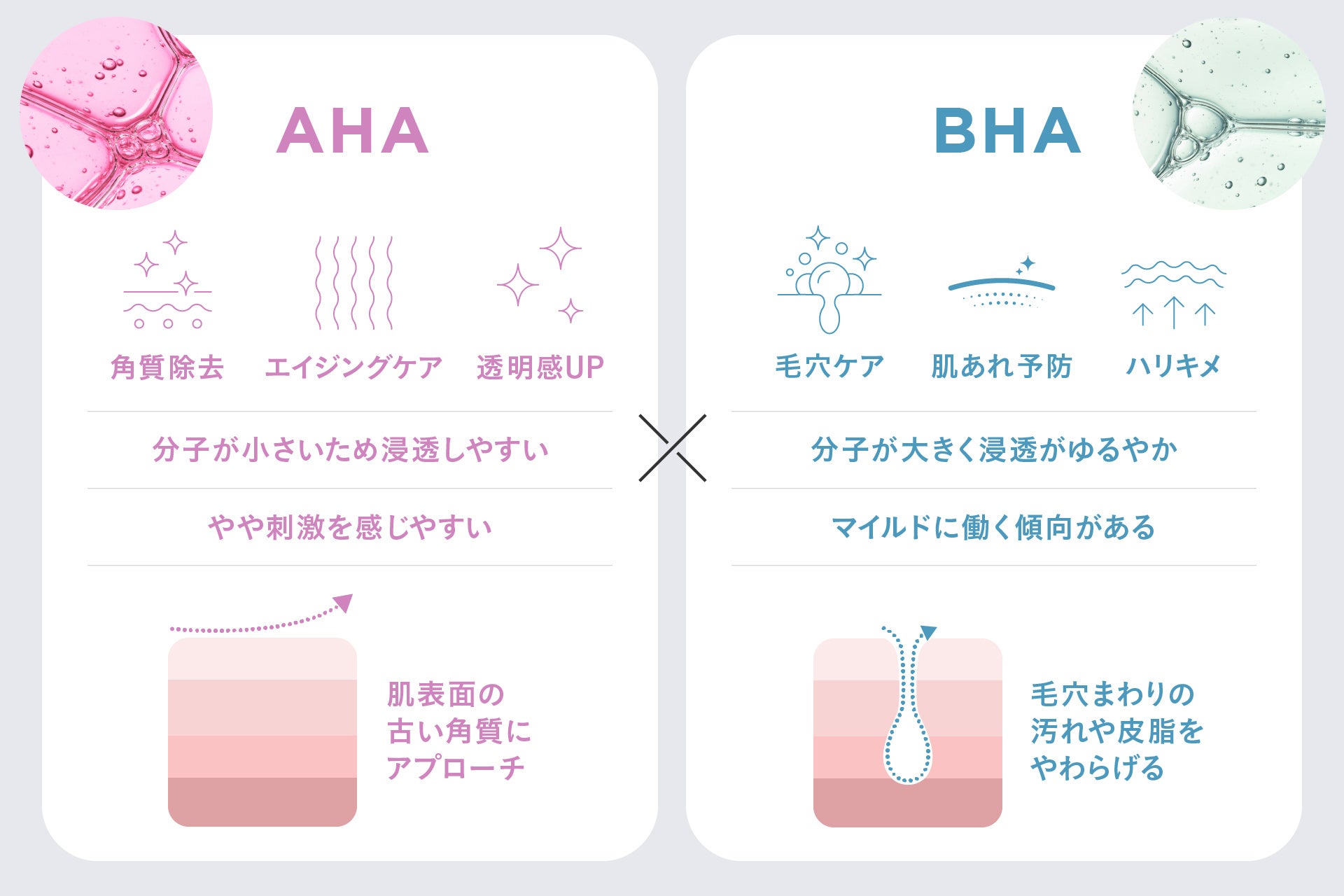 AHA(*1): 主に「肌表面」の古い角質にアプローチ。