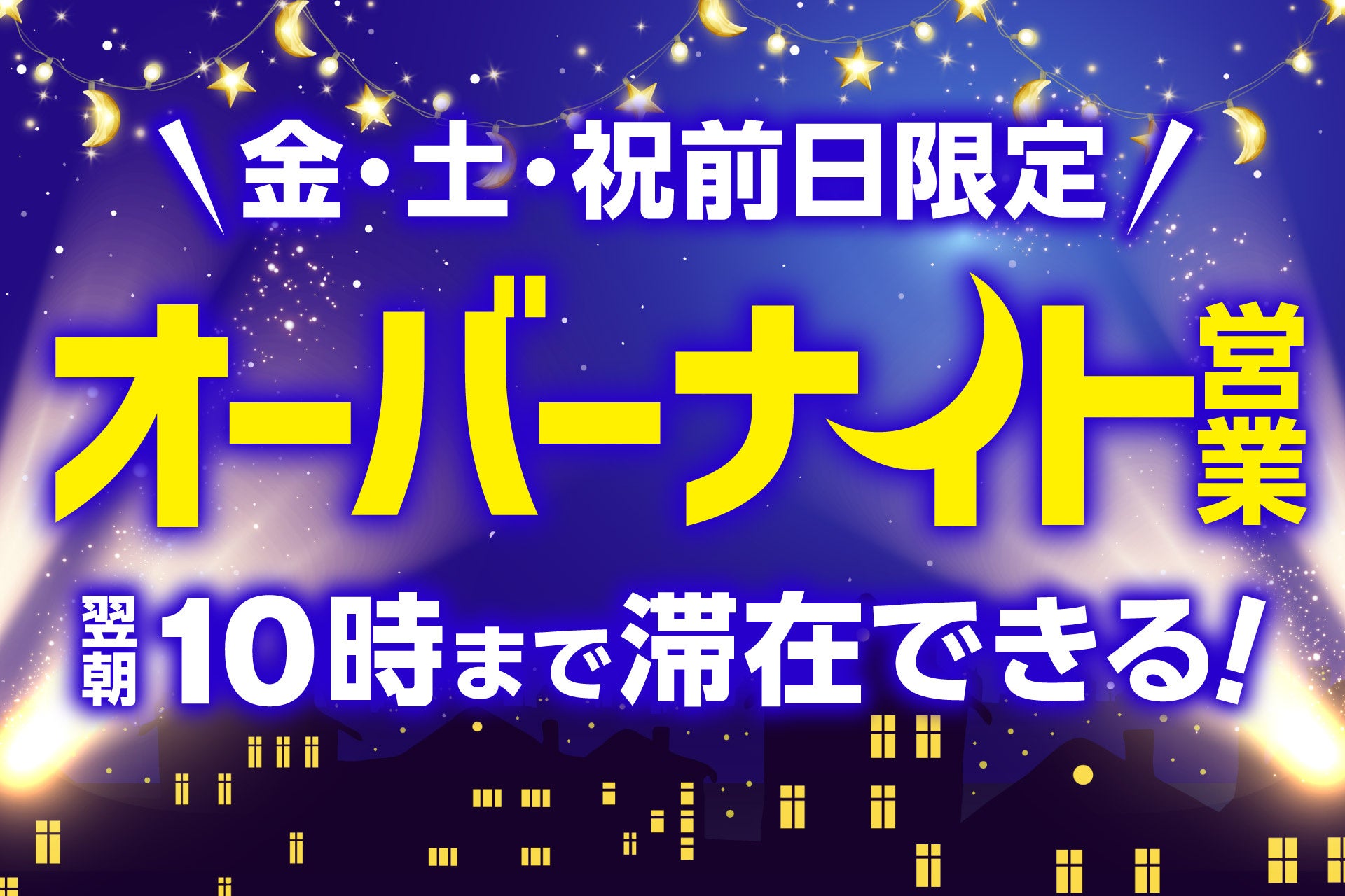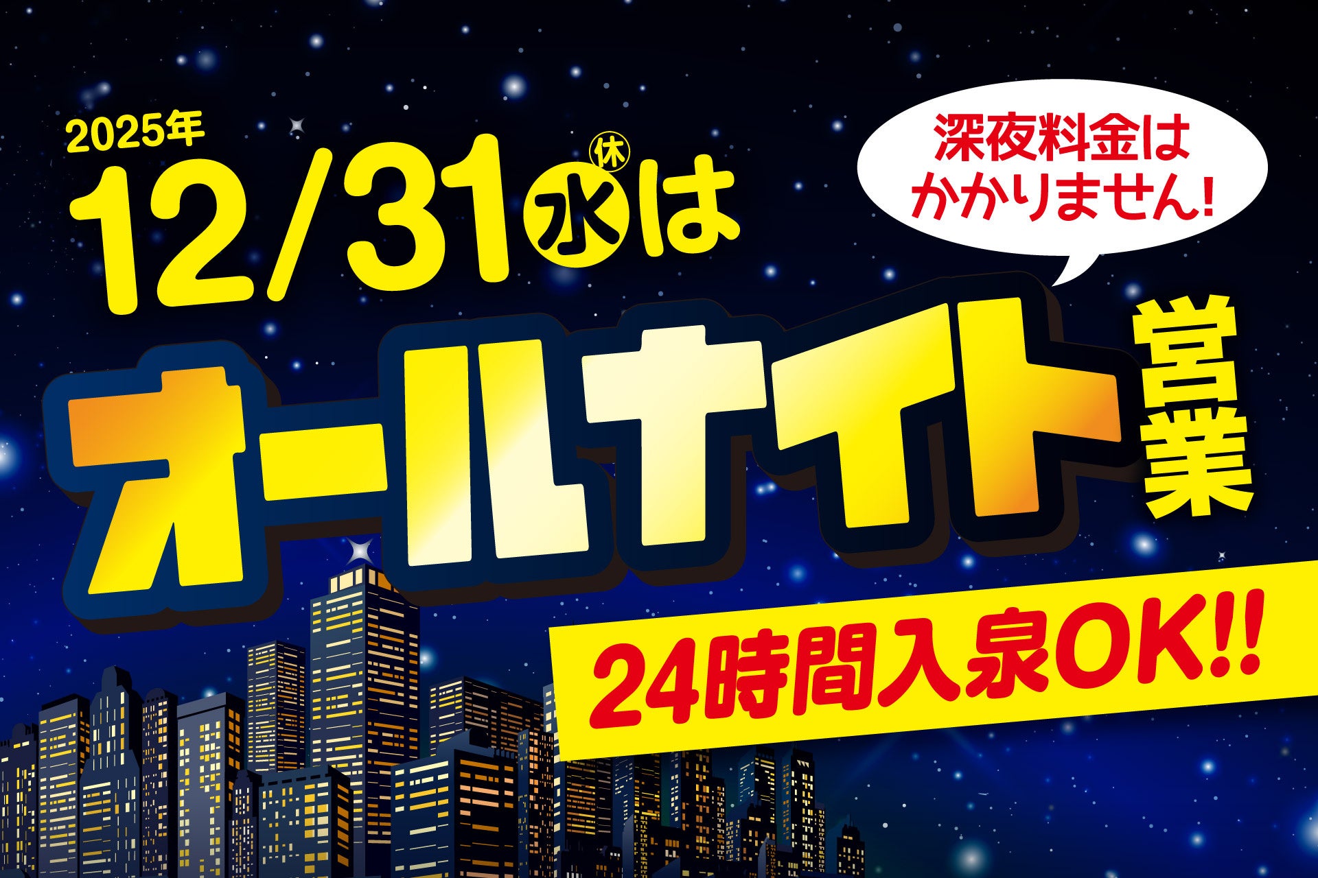 12月26日(金)から1月3日(金)までの期間は、連日翌朝10時までのオーバーナイト営業を実施いたします。深夜1時までにご入館いただくと、そのまま館内でゆったりおくつろぎいただけます(深夜1:00~朝6:00の入浴はできません)。遠方から帰省中の方や、深夜移動の疲れを癒したい方にも大変便利です。