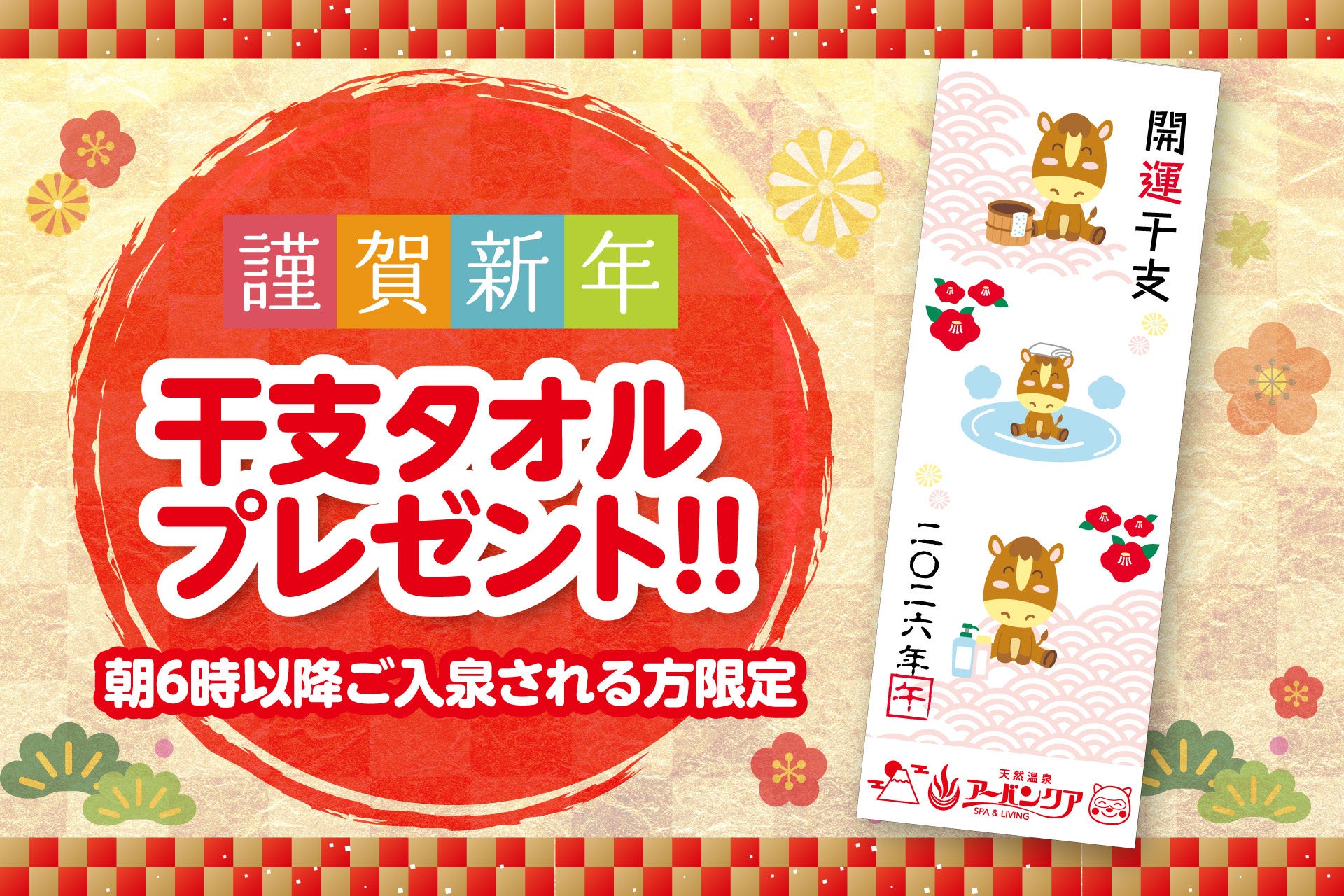 元旦の1月1日(木)にご来館いただいたお客様には、新年の始まりを祝して干支がデザインされたオリジナルタオルをプレゼントいたします。新しい一年の始まりを、アーバンクアの初風呂で心身ともにリフレッシュしてお迎えください。