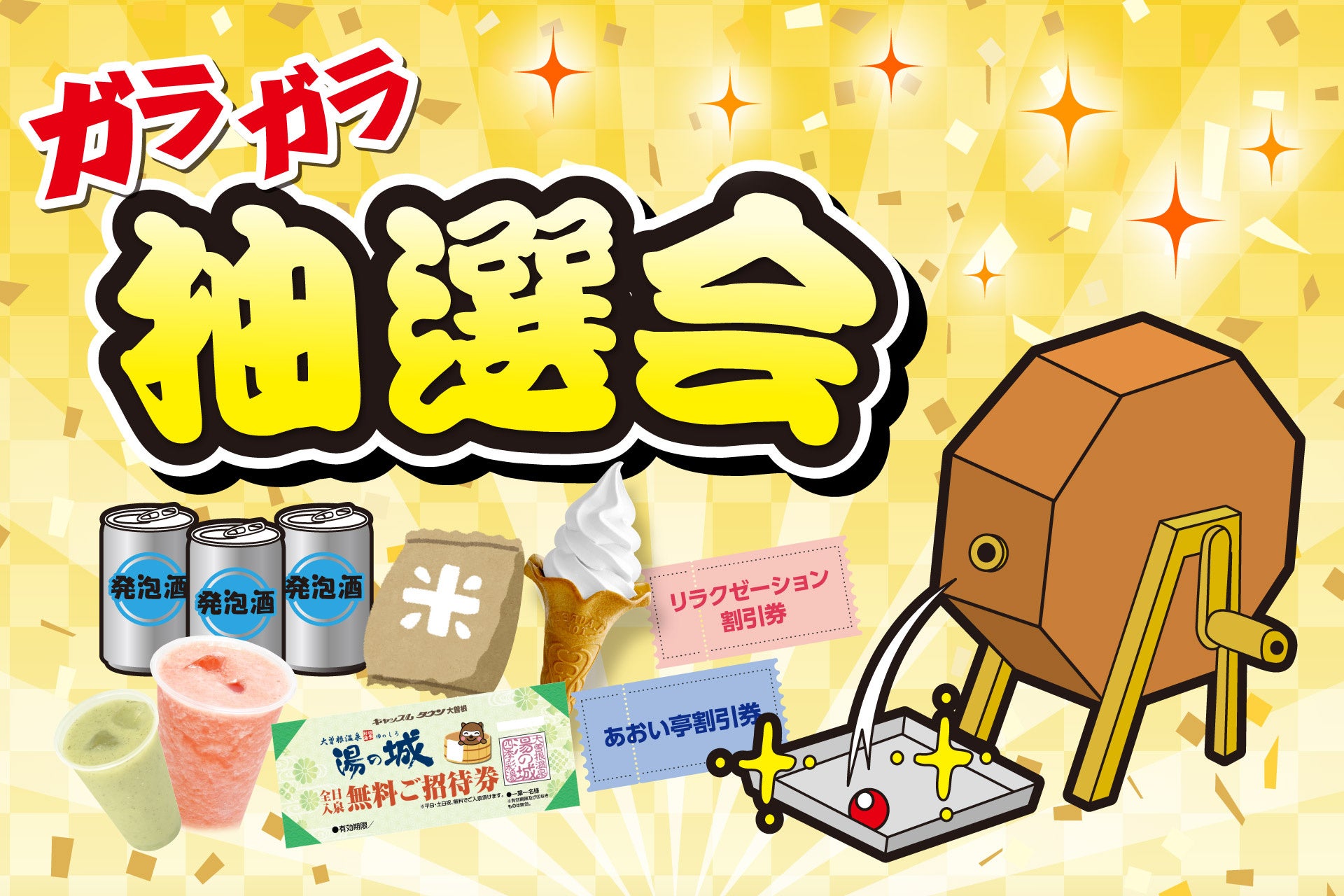 何が当たるかはお楽しみ!豪華景品がその場で当たる大チャンスです。無料招待券リラクゼーション割引券など、湯の城をより満喫できる景品をご用意しています。