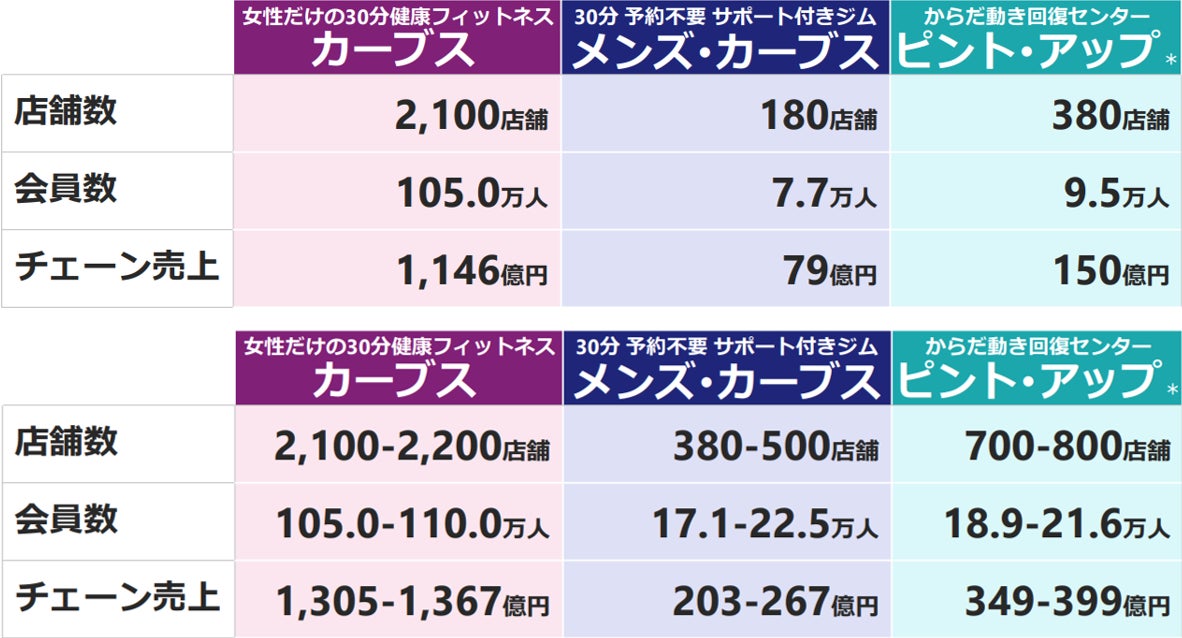 主力ブランド「女性だけの30分健康フィットネス カーブス」の成長とともに、メンズ・カーブス(25年11月現在32店舗)、ピント・アップ(25年11月現在44店舗)の2つの新規事業の多店舗展開を本格化し、複数ブランドによる成長戦略を展開して参ります。