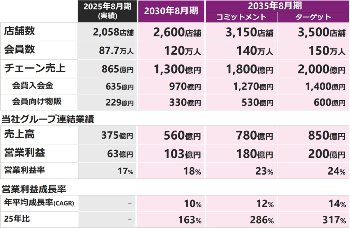 2030年2,600店120万会員 営業利益100億、2035年3,500店150万会員 営業利益200億へ