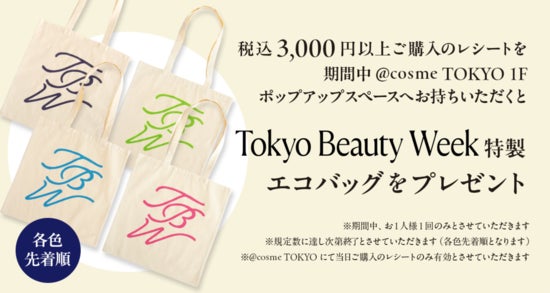 11/19(火)~11/25(火)の期間、@cosme TOKYOで3,000円(税込)以上お買い上げいただいた方に、【毎日先着100名】にTBWエコバックをプレゼント!
