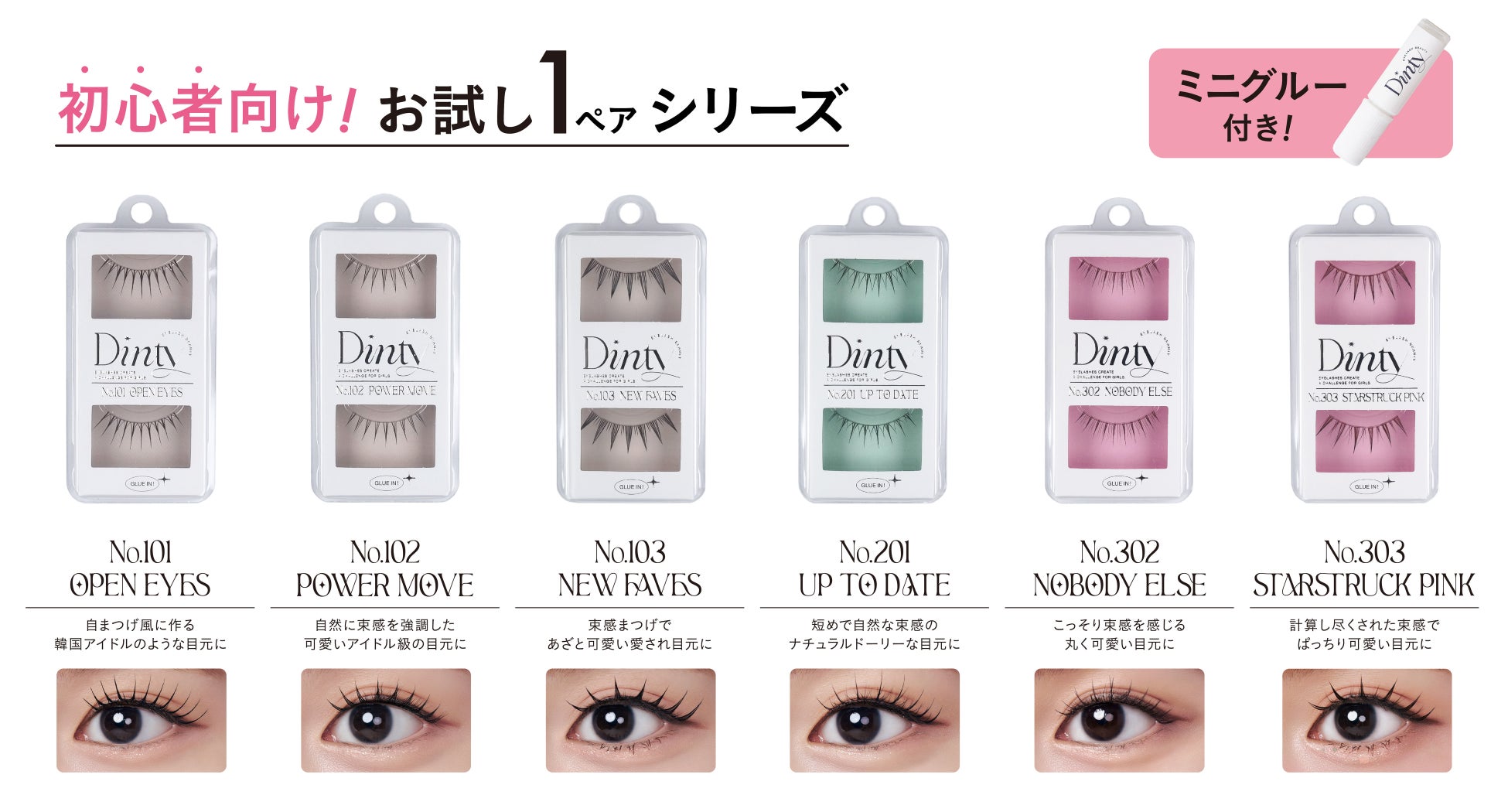 まだつけまつげを使ったことがない初心者さんに向けた、グルー付きの1ペアタイプは、上位人気ランキング6位までのNo.101オープンアイズ、No.102パワームーブ、No.103ニューフェイヴス、No201アップトゥデート、No.302ノーバディエルス、No.303スターストラックピンク、から登場!
