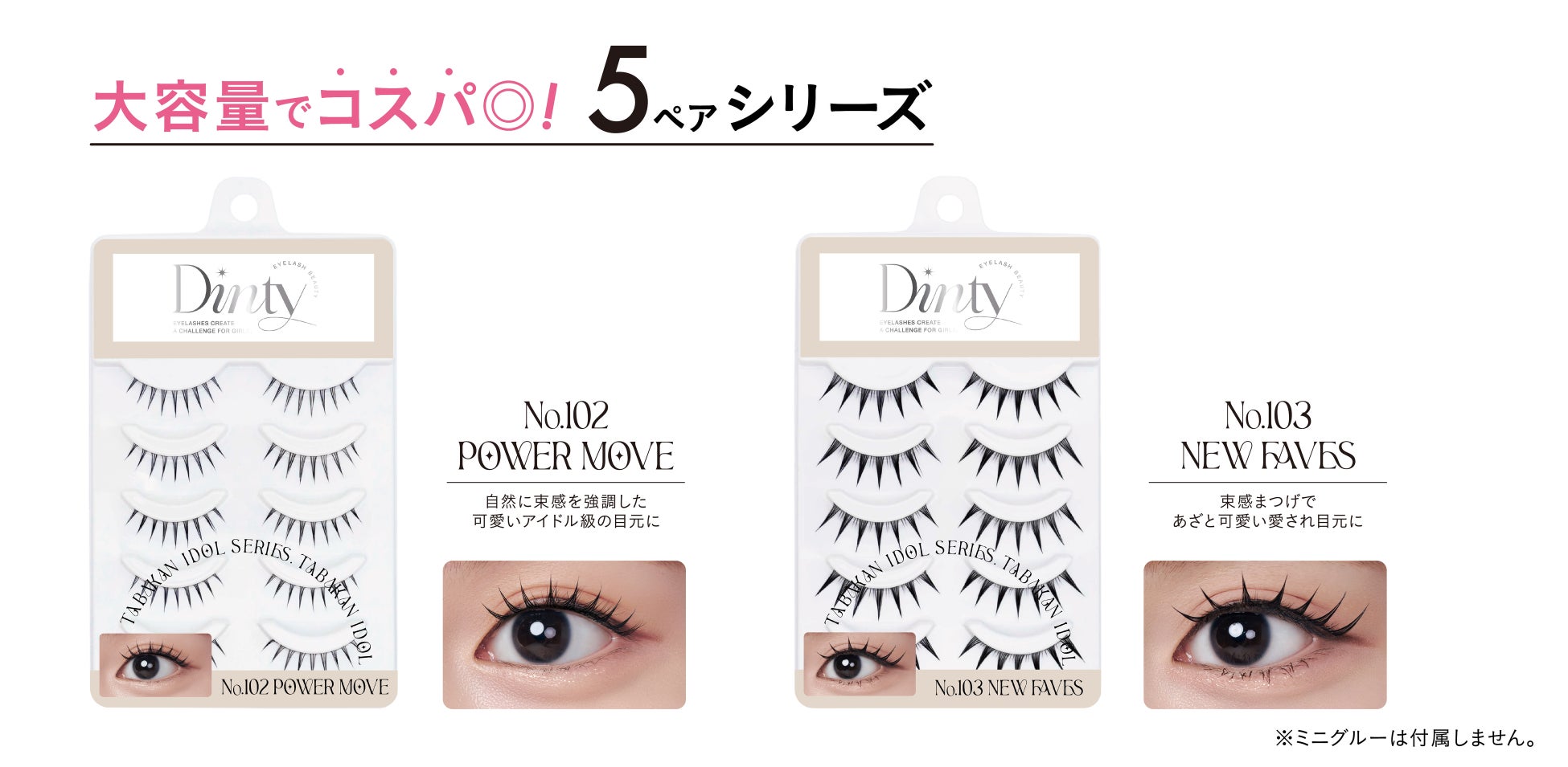 株式会社サン・スマイル(本社:東京都港区/代表取締役社長:田中徳也)はアイドル級の束感まつげを演出するつけまつげブランド『Dinty(ディンティー)』より、人気品番の1ペアタイプ(グルー付き)と5ペア大容量タイプを発売いたします。