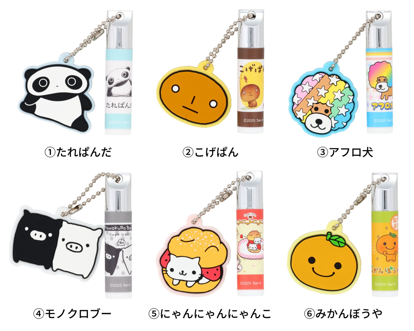 新商品は、2000年前後に一世を風靡した『レジェンドキャラクター』をモチーフにしたコスメ&雑貨です。ラインナッ プは、ラバーミラーマスコット付きリップクリーム・アクリルチャーム付きハンドクリーム・フロッキー前髪クリップの 全3アイテム。それぞれ「たれぱんだ」「こげぱん」「アフロ犬」「モノクロブー」「にゃんにゃんにゃんこ」「みかん ぼうや」の全6キャラクターのうち、いずれか1つが当たるブラインド仕様になっています。かわいらしさと実用性を兼ね備えた、懐かしさを感じるキャラクターたちが揃ったシリーズです。