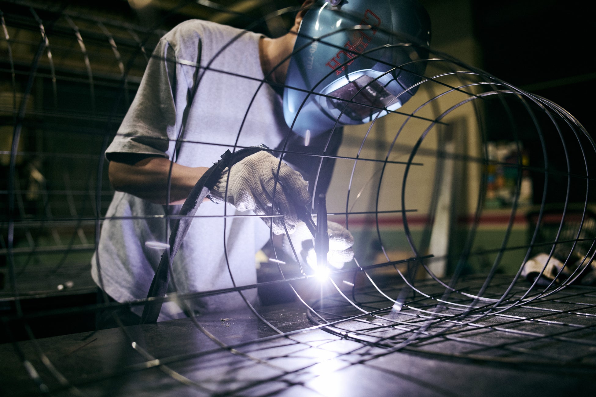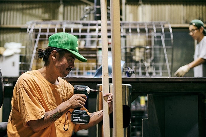 オブジェの形状は、SALONIA の高機能プレミアムモデル「スムースシャインドライヤー」をイメージしてデザイン。手作業でドライヤーの形状を再現しつつ、骨組みの中に小型家電を入れるため、構造設計の強度も計算して製作しました。スムースシャインドライヤーの、陶器のように上質な手触り感を再現すべく、アイアンの骨組みはブラックに塗装しマットな質感に仕上げました。