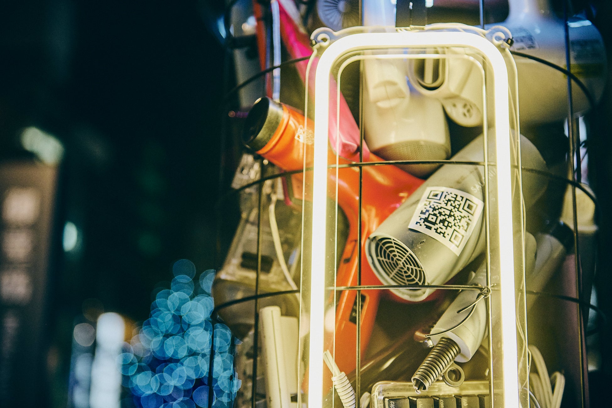 今回のプロジェクトは「環境も、お客様も、もっと美しくなってもらいたい」という SALONIA の想いを、屋外の巨大オブジェを通じて、より多くの方々に知っていただくために行いました。高さ約 3 メートルの巨大ドライヤーオブジェの中には、100 台以上の“捨てられるはずだった”小型家電が入っています。これは、リサイクルされた資源が新たなものを形づくることを表現しています。