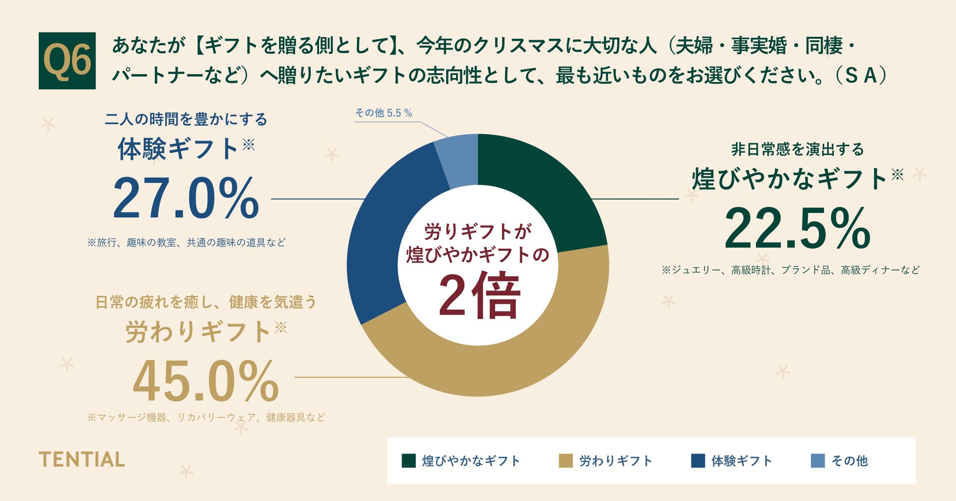今年のクリスマスギフトの志向性について質問したところ、「非日常感を演出する煌びやかなギフト(22.5%)」に対し、「実用性の高い労わりギフト(45.0%)」が2倍の支持を集める結果となりました。 Q5の結果で「好みが出るものは失敗しやすい」という傾向が見られましたが、そうしたリスクを避け、本質的な課題である「疲れ」を確実に解決できる「労わりギフト」へ需要がシフトしていることが明確に表れています。