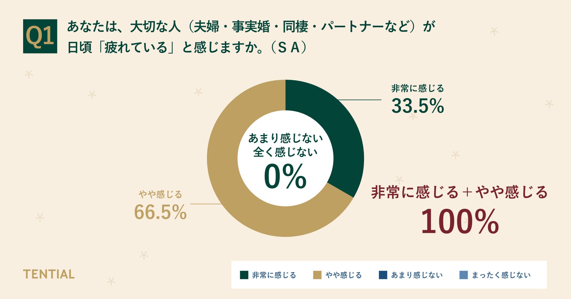 大切な人の日頃の様子について、「非常に感じる(33.5%)」、「やや感じる(66.5%)」と回答した人を合わせると、実に100%の方がパートナーに対して何らかの「疲れ」を感じ取っているという結果に。昨今の共働き世帯の増加や働き方の変化に伴い、多くのパートナー間で「疲労」が日常的な課題となっている現状が浮き彫りとなりました。