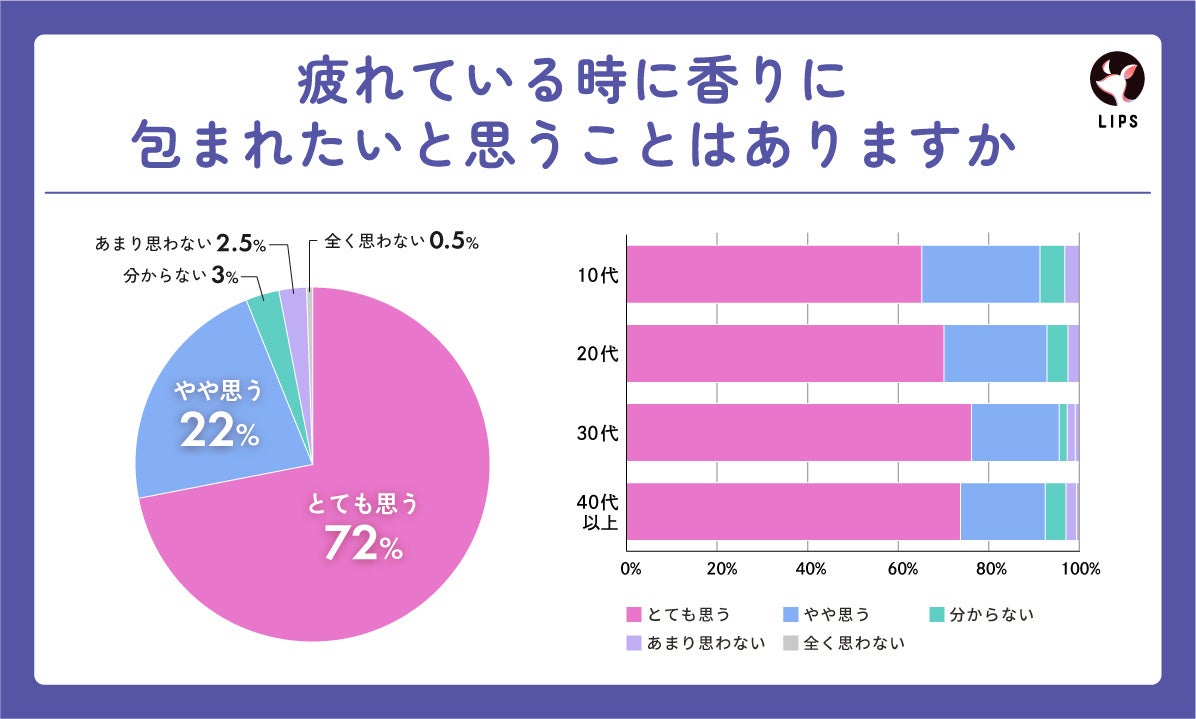 また、疲れているときのセルフケアに「香り」を重視する人も多いことがわかりました。従来のセルフケアアイテムに落ち着く香りを用いるのはもちろん、香水、柔軟剤、もっと広く考えればお菓子や飲料なども、「癒やし」「疲れ」などがマーケティングや商品開発のひとつのキーワードになるかもしれません。