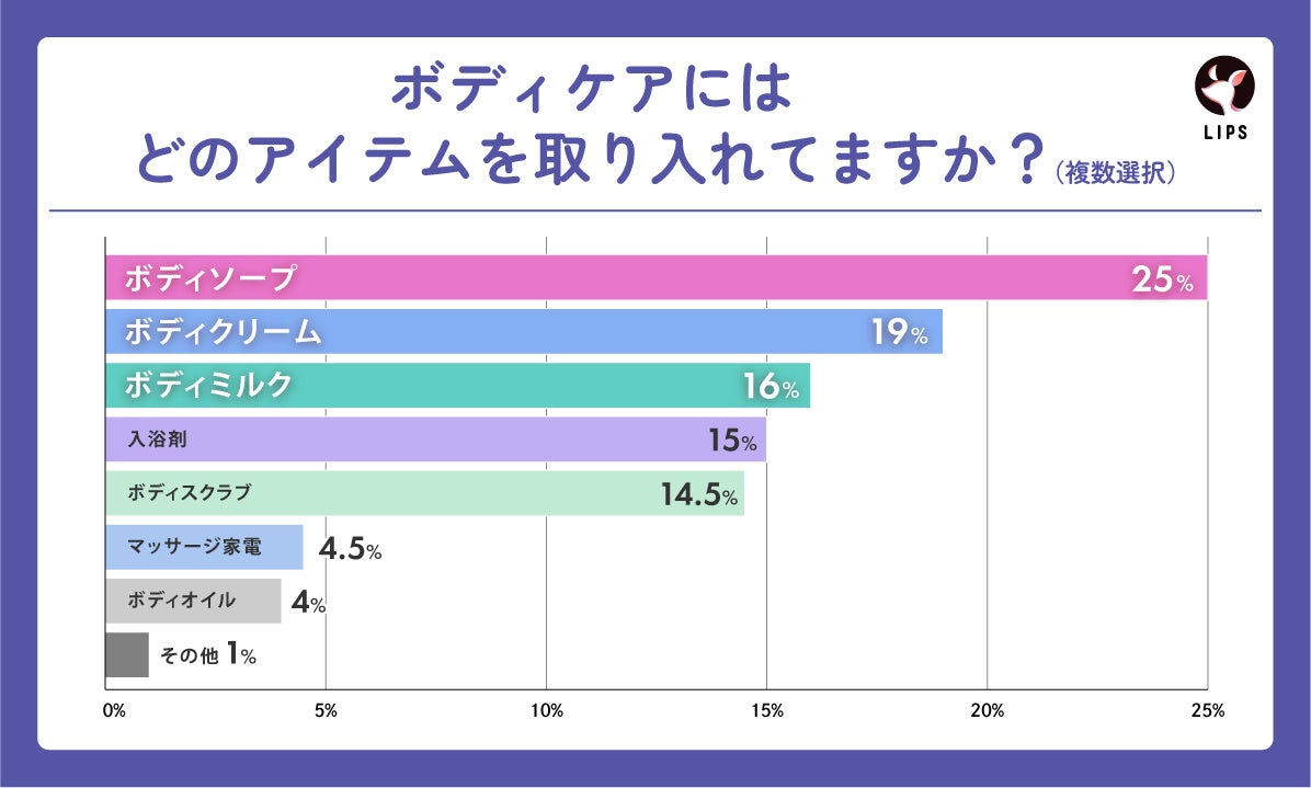 使用しているボディケアアイテムでは「ボディソープ」が一番多く、アウトバスケアでは「ボディクリーム」「ボディミルク」人気が高い結果に。「ボディオイル」は少数派となっており、保湿はしたいけれど軽い仕上がり感が求められていると考えられます。