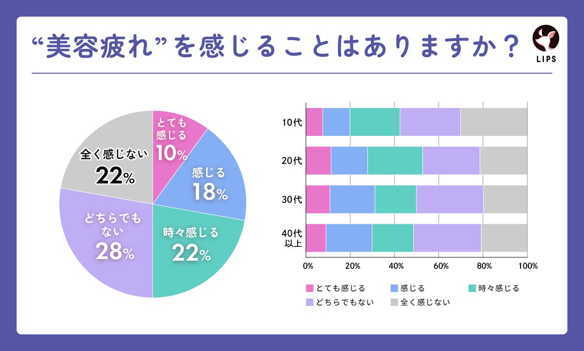 “美容疲れ”も最近耳にするようになったワードのひとつ。LIPSユーザーの中でも「とても感じる」「感じる」「時々感じる」の回答を合わせると、約半数の人が”美容疲れ”を感じることがあると判明しました。