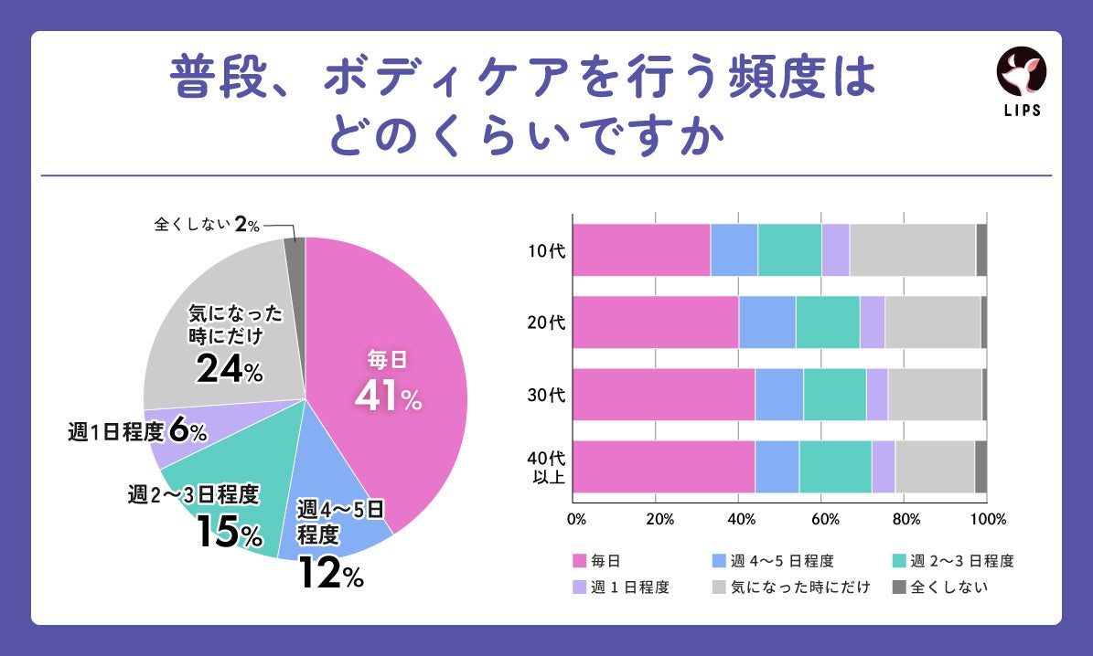 ボディケアを「毎日行なっている」と答えたのが全体で41%ほど、世代ごとの調査でも各世代50%を満たない数値でした。昨年行ったLIPS laboの調査では「毎日行なっている」と答えたのが51%と、今年は10%ほど下がる結果に。