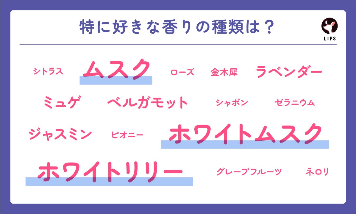 上位3つは、「ムスク」「ホワイトムスク」「ホワイトリリー」となりました。全体的には上の質問の回答結果のように「フローラル系」「ムスク系」の香りが挙がっており、さらに名前に「ホワイト」がつくような清潔感を連想させる香りの人気の高さがうかがえます。