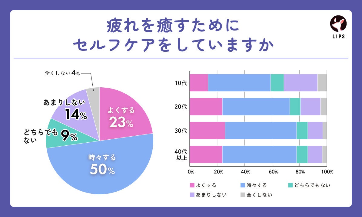 “疲れを取るためのセルフケア”を取り入れているかの調査では、全体で「時々する」「よくする」合わせて70%以上と、積極的にセルフケアを行なっている様子がわかります。