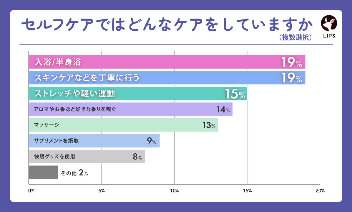 上位の回答は「入浴/半身浴・・・19%」、「スキンケアなどを丁寧に行う・・・19%」「ストレッチや軽い運動・・・15%」となりました。