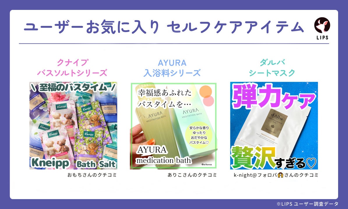 みんなの推しセルフケアアイテム調査では、『クナイプ』のバスソルト、『AYURA』の入浴料シリーズ、『ダルバ』のシートマスクを挙げる人が多数となりました。