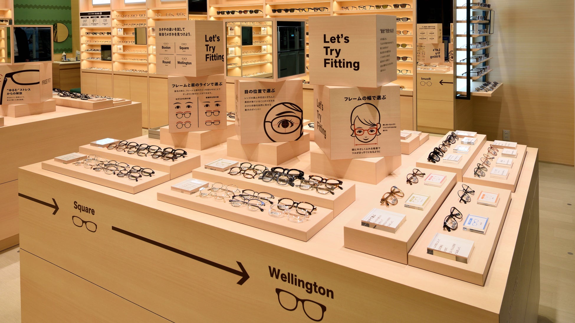 「似合うが見つかる眼鏡市場」のコンセプトを表現するために、これまではブランド毎に陳列していた商品を、メガネのデザイン毎(スクエア型、ウエリントン型、ボストン型など)に展開することで、お客さまが自分に似合うデザインの中から自由にメガネを掛け比べ、好きなブランドや掛け心地の中から商品を選ぶことができる、新たな店舗体験を提案します。