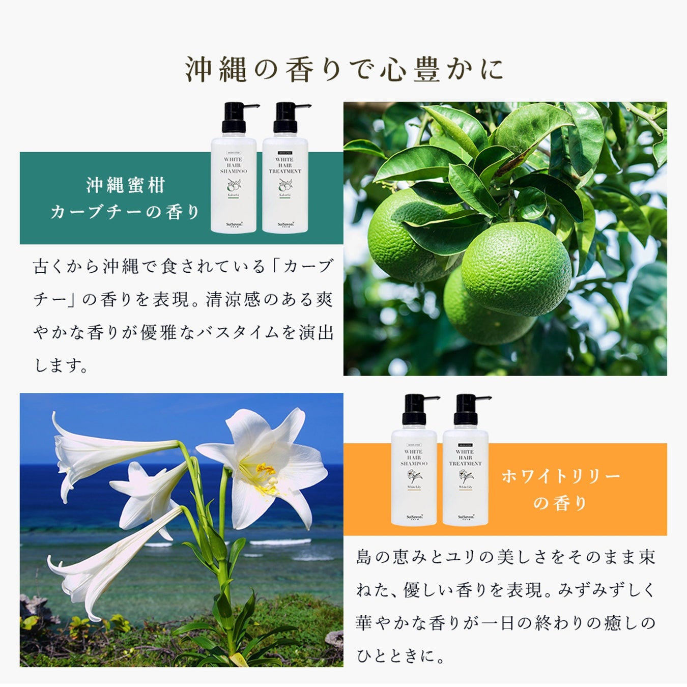 薬用ホワイトボディソープでも展開している首里石鹸の人気の香り「沖縄蜜柑カーブチーの香り」と「ホワイトリリーの香り」の2種類をご用意しています。 その日の気分や季節に合わせて香りを変えるのもおすすめです。