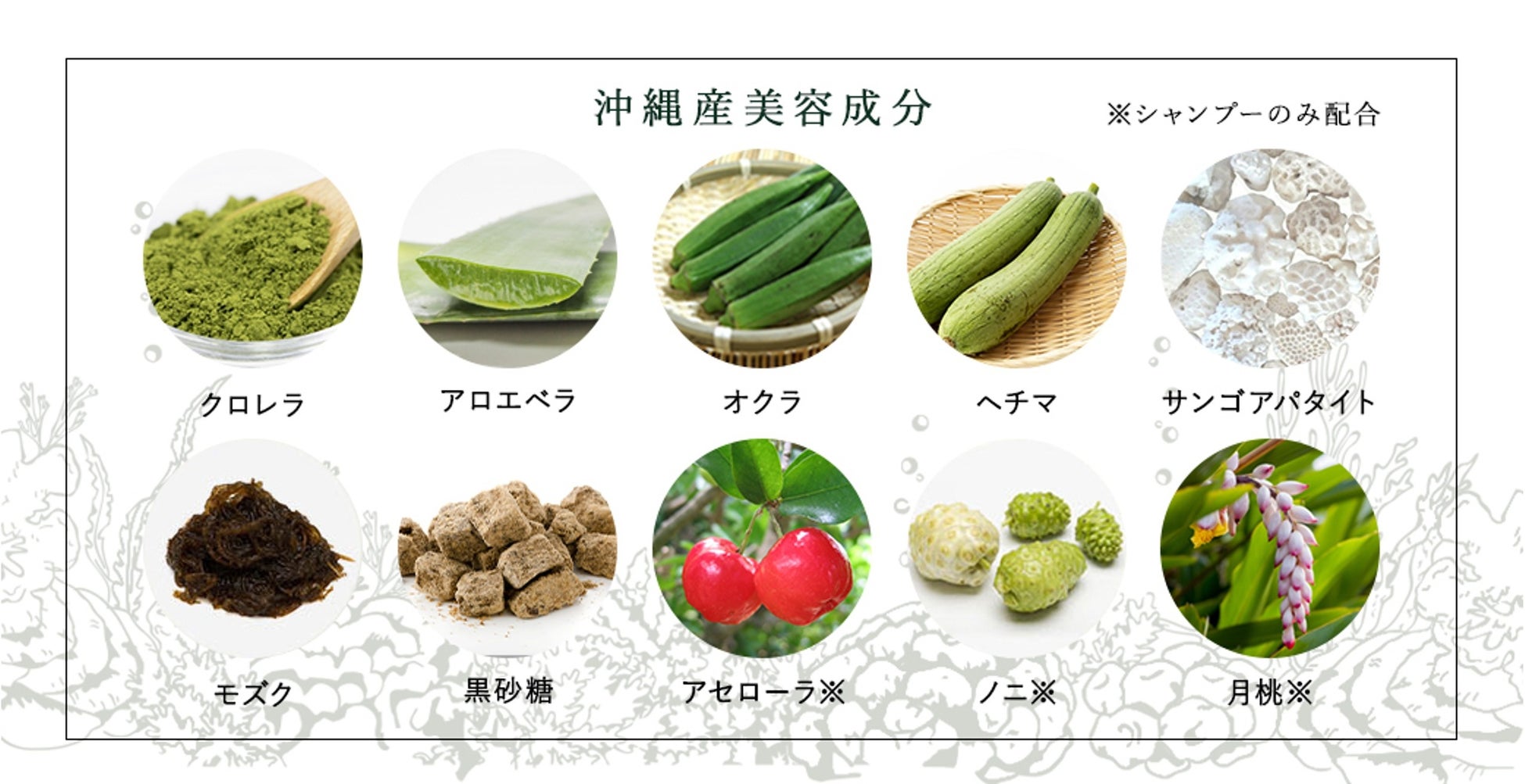 与那国産天然化石サンゴ由来のアパタイトをはじめ、10種の沖縄美容成分が頭皮環境を整え、健やかな髪へ導きます。