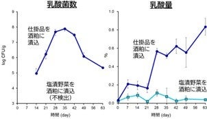 図4. 実験室内で奈良漬の製造プロセスを再現した発酵試験における乳酸菌数(左)および乳酸量(右)の推移。仕掛品を酒粕に漬け込むと乳酸菌数が増加し乳酸が生成される。