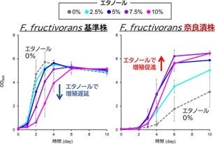 います。今回の結果は、こうした製造プロセスによって、酒粕中で育った F. fructivorans が野菜を介して受け渡され、再び新しい酒粕で増殖するという長期的な微生物循環が成立していることを示しています。つまり奈良漬は、蔵内で F. fructivorans を代々育てながら発酵を進める食品であることが実験的に証明されました。さらに、発酵前後の酒粕の成分の変化を、キャピラリー電気泳動-フーリエ変換質量分析(CE-FTMS:注 8)によるメタボローム解析(注 9)で比較したところ、乳酸に加えて、うま味成分であるイノシン(注 10)、コク味の付与に寄与するグルタチオン(注 11)、そして機能性成分として知られる S-アデノシルメチオニン(SAM:注 12)が増加していることが明らかになりました。これらの結果は、F. fructivorans が奈良漬の風味や機能性の向上にも寄与できる可能性を示しています。それでは、なぜ F. fructivorans だけが奈良漬という特殊な環境で生き抜き、発酵を担うことができるのでしょうか。奈良漬の発酵環境である酒粕には、高濃度のエタノールが含まれており、ほとんどの微生物の生育が阻害されます。このため、奈良漬は望ましくない微生物による腐敗が起こりにくく、長期熟成が可能となっています。しかしその一方で、なぜこの乳酸菌だけが発酵を進められるのかは謎のままでした。そこで研究グループは、F. fructivorans の生育特性を詳しく調べました。様々な濃度のエタノールを添加した培地で比較試験を行ったところ、基準株(注 13)では他の微生物と同様にエタノール濃度が上がるほど生育が抑制されました。一方で、本研究において奈良漬から単離した F. fructivorans(以下、奈良漬株)は、エタノールを含まない環境での生育は遅いものの、5~10%という奈良漬と同程度のエタノールを添加すると生育が顕著に促進されることが分かりました(図 5)。