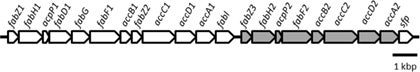 図6. Fructilactobacillus frctivorans奈良漬株における脂肪酸生合成遺伝子クラスターと、発現が顕著に抑制されている遺伝子(グレー)