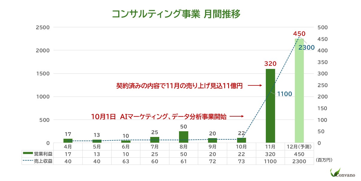 DataStrategy社は、AIマーケティング・データ分析領域で急速に事業を拡大しており、2025年11月に売上収益11億円、12月には最低15億円以上の着地を見込むなど、1ヶ月で4億円以上の伸びを記録しています。