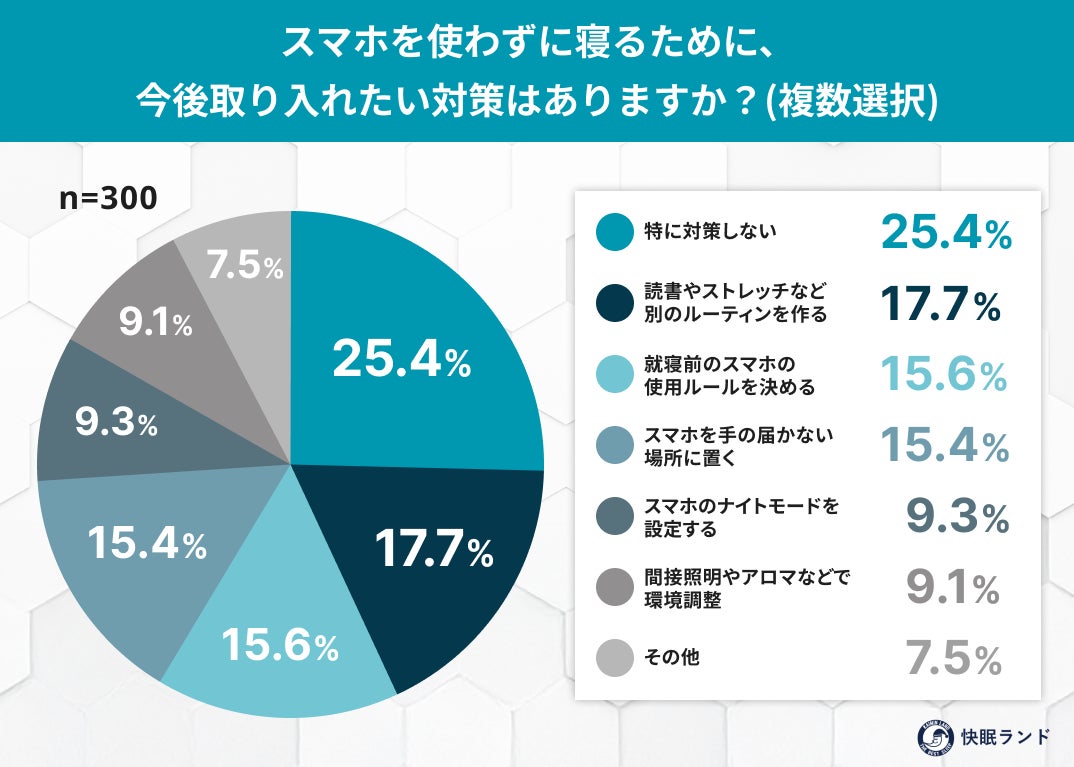 → 最多の「特に対策しない」は25.4%と消極的だが、約7割は何らかの工夫を取り入れようとしていることがわかる。「別ルーティンの導入」(17.7%)や「使用ルールの設定」(15.6%)など、行動変容に結びつく選択肢も一定数選ばれた。一方で対策なしが最大項目であることから、改善ニーズよりも“習慣の惰性”が勝っている層が多いことがうかがえる。