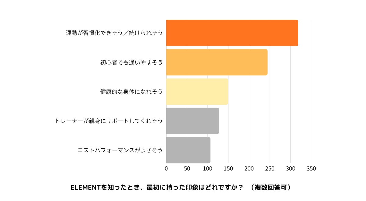 ELEMENTに対するイメージについて調査したところ、「運動が習慣化できそう」「初心者でも安心して通えそう」という回答が最も多く、ELEMENTが提供する“続けやすい仕組み”と“安心して始められる環境”が高く評価されました。特に、初めて運動を始める方から「続けられる自信がついた」「トレーナーが丁寧で安心できる」といった声も多く寄せられています。