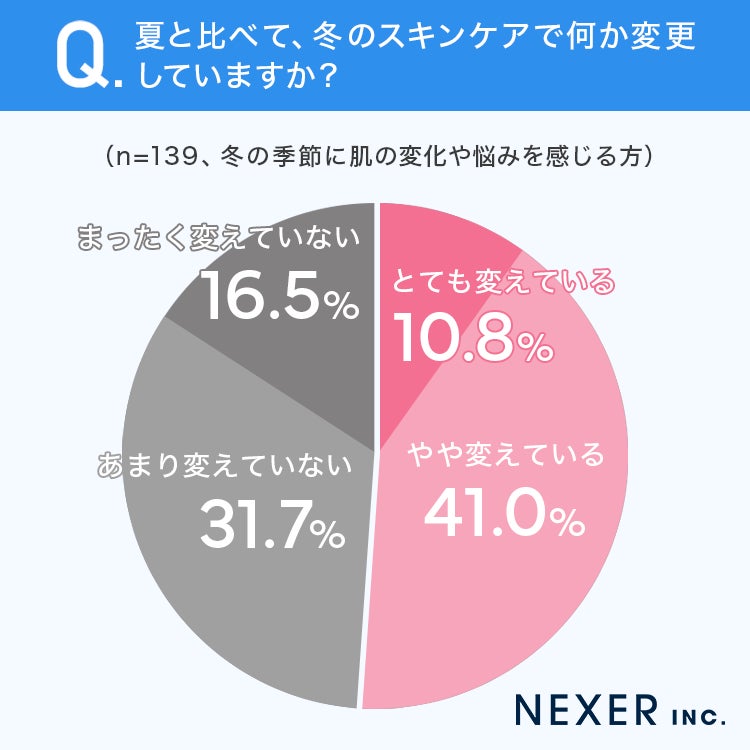 続いて夏と比べて、冬のスキンケアで何か変更しているか聞いてみました。