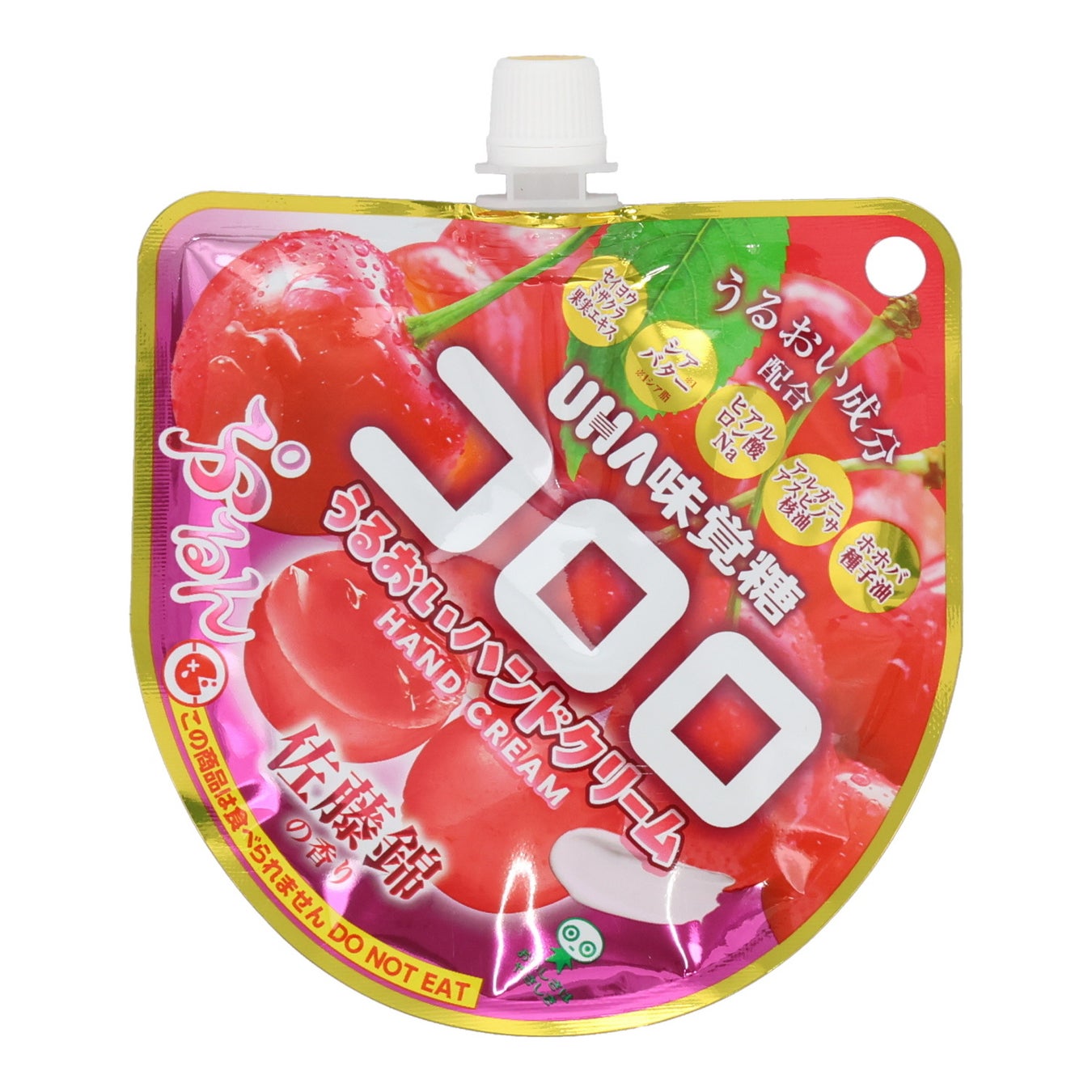 新商品は“プチっと弾ける食感”でおなじみのグミ『コロロ』をイメージした、保湿成分※配合のハンドクリームです。まるで本物のパッケージの中には、しっとりと手肌をうるおすハンドクリームが入っています。香りは「巨峰」「シャインマスカット」「佐藤錦」「清水白桃」の全4種類をラインナップ。それぞれの香りの合わせたパッケージデザインで、気分に合わせて香りを選びながらハンドケアを楽しめます。乾燥が気になる今の季節にぴったりのアイテムです。