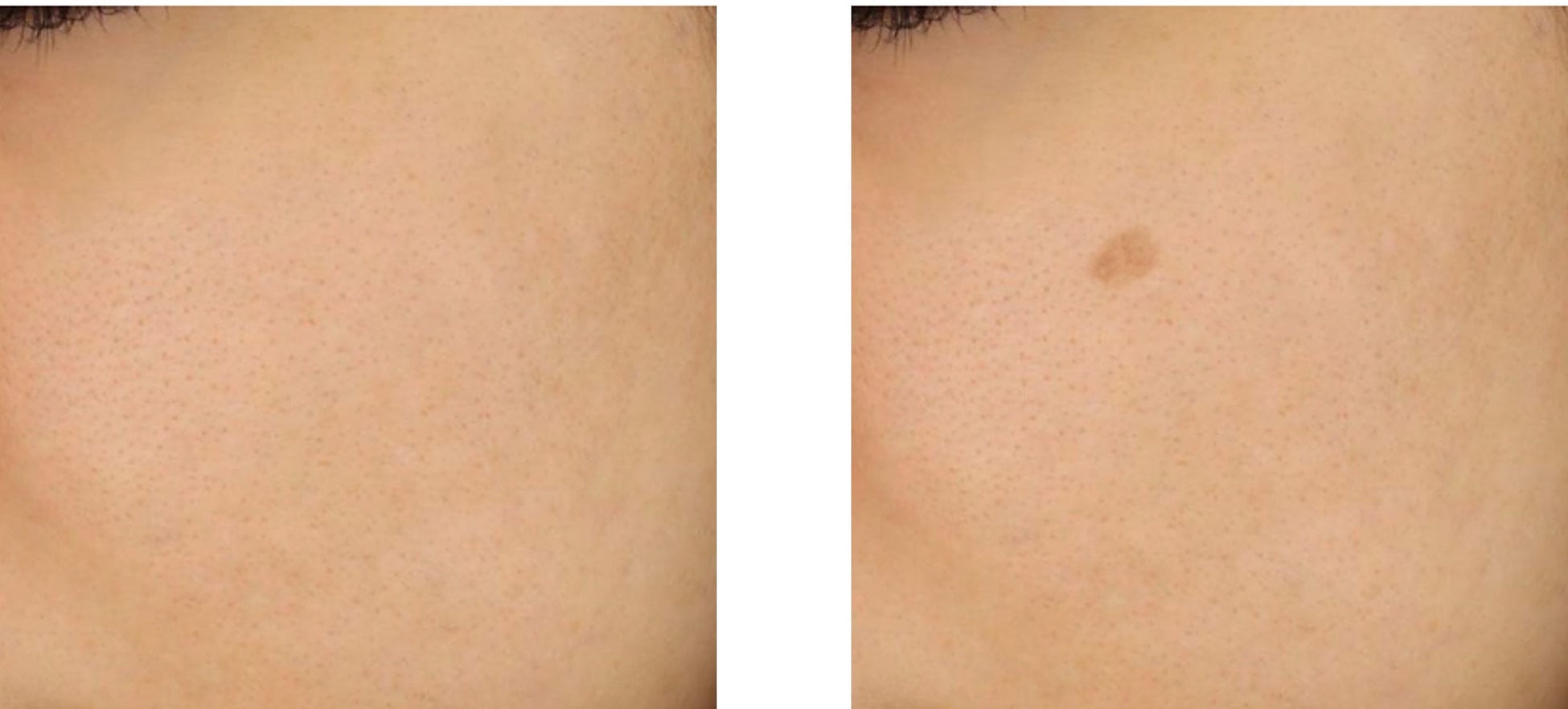 図2 シミのない肌(左)とシミが肌表面に現れた肌(右)のイメージ画像 シミのない肌の肌内部ではミ発生に向けた何らかの変化が起きているのではと考え、遺伝子レベルで検証を実施