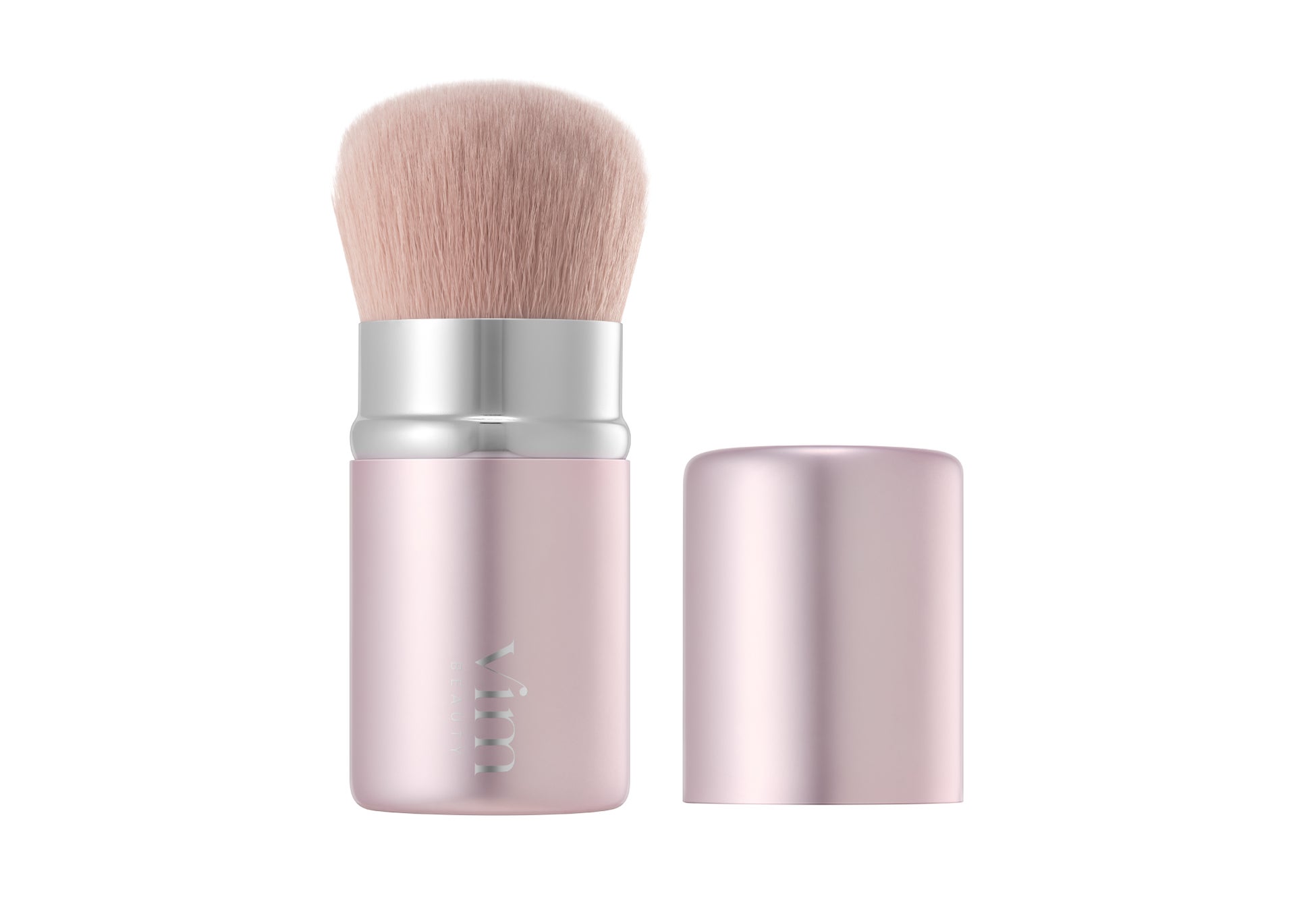 ピンクのきらめきで頬を彩るスライド式マルチブラシ。