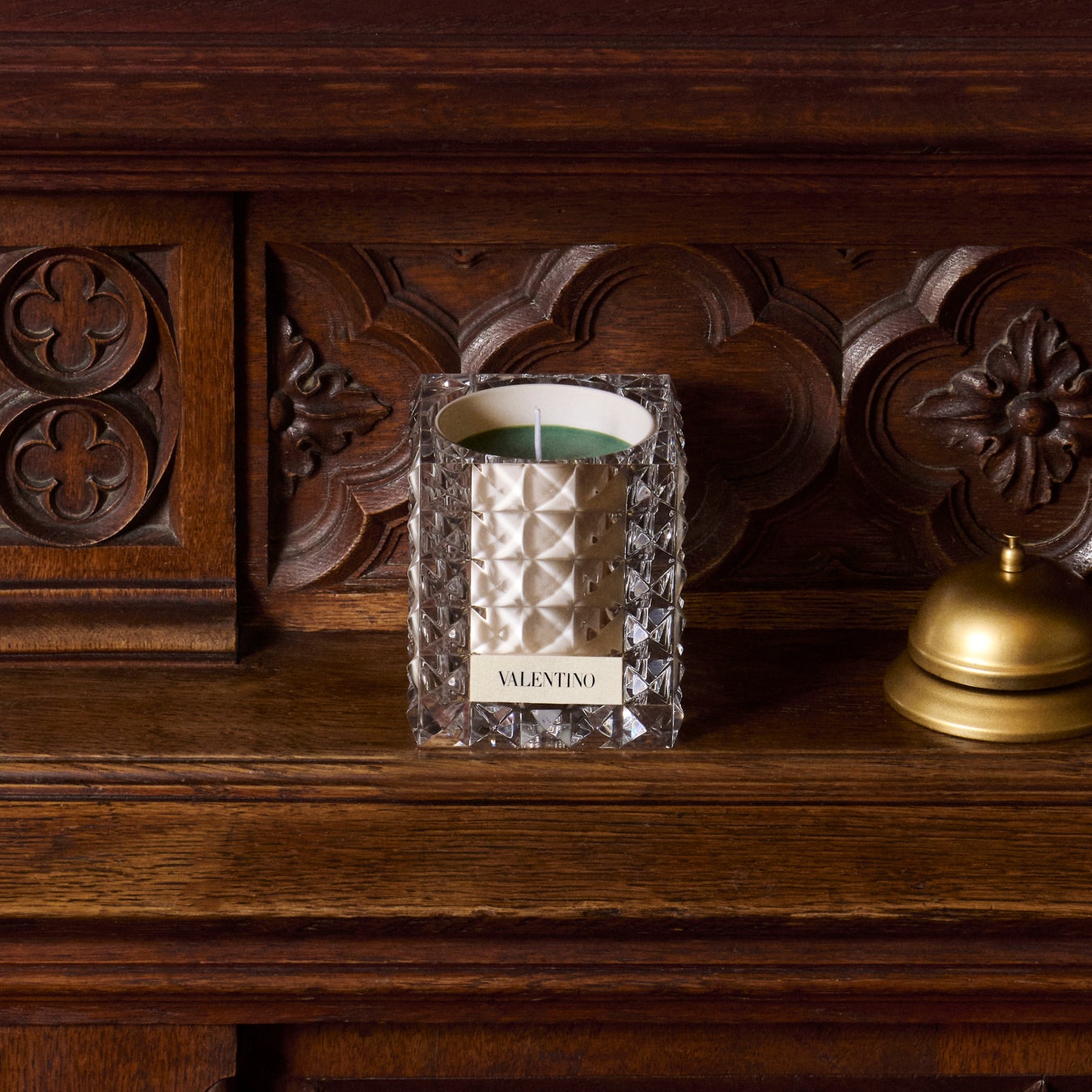 アートオブジェとして構想されたガラス製のキャンドルホルダー「ヴァレンティノ レ ブジョワール」は、ローマ宮殿を象徴するブニャート装飾に着想を得たヴァレンティノのアイコニックなスタッズが特徴です。インテリアの中心的存在になるキャンドルホルダーは、メゾンの芸術性と時代を超えたエレガンスへのこだわりを体現しています。キャンドルだけではなく、メイクブラシホルダーや大切な記念品のディスプレイなど、装飾品としても再利用することができ、ヴァレンティノの世界観を永く表現し続けます。