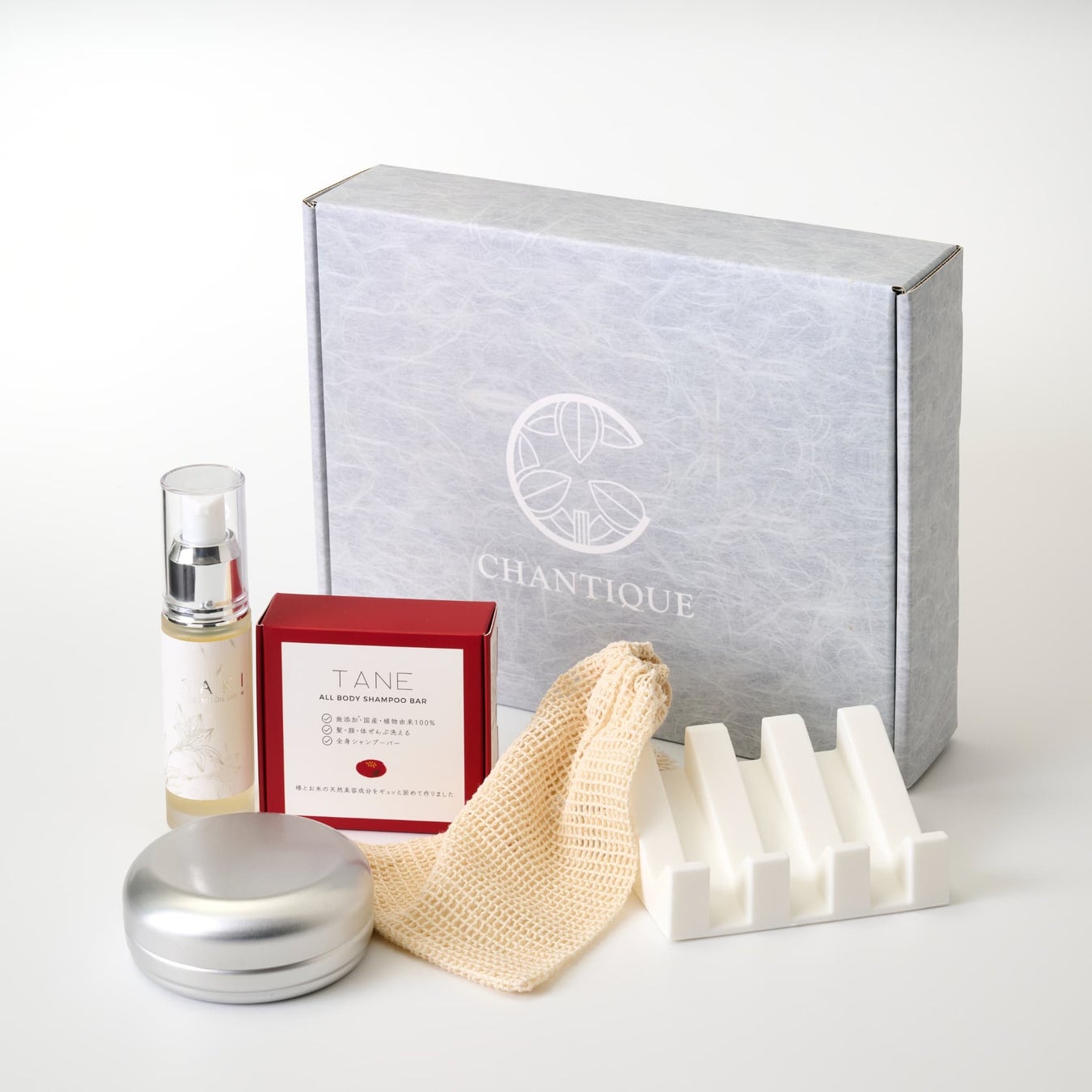 洗うはこれ1個の「全身シャンプーバーTANE」と、美容ケアはこれ1本の「SAKIオイルセラム」の厳選ギフトボックス。シリコンホルダー(置き台)、持ち運び用アルミケース、ザイザルコットンの顔用泡立てネットバッグ、オリジナルギフトボックスに入っており、全身シャンプーバー生活に必要なすべてが揃います。