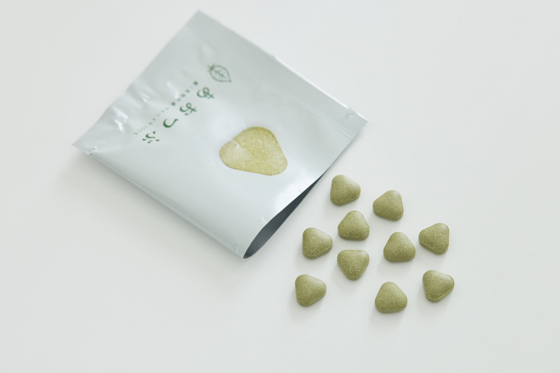 「あおつぶ」はモロヘイヤ100%の野菜粒です。原材料はモロヘイヤのみで、1粒に約2.5枚のモロヘイヤの葉が含まれています。