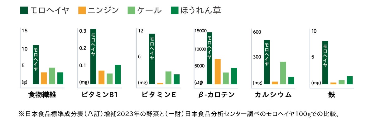 各食品:日本食品標準成分表2020年版(八訂) モロヘイヤ生葉:(一財)日本食品分析センター調べ 各100gあたりの数値