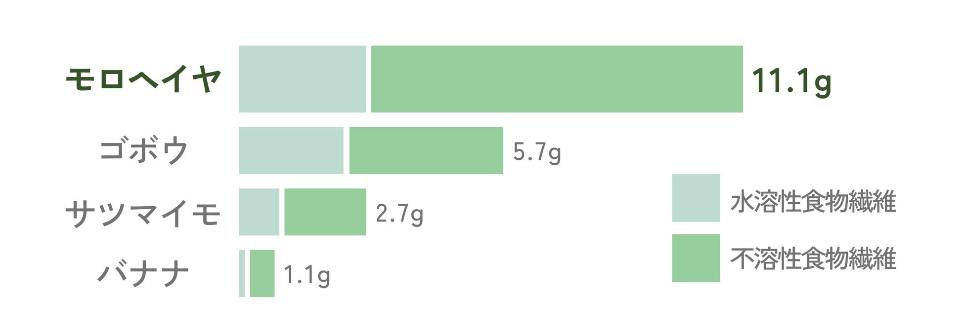 モロヘイヤの食物繊維はバナナのおよそ10.5倍。野菜の中でもトップクラスです。「水溶性食物繊維」と「不溶性食物繊維」をバランスよく含む、貴重な野菜でもあります。