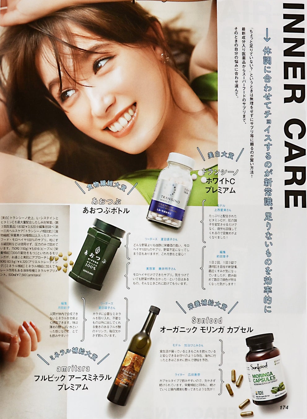 発売以来34年間、モロヘイヤ100%にこだわってきた働く食物繊維モロヘイヤ100%の『あおつぶ』は、雑誌「CLASSY.」が実施した「ウェルビーBODY大賞 2023」で、INNER CARE部門の「食物繊維大賞」を受賞して以来、「あおつぶ」はインナーサポートに関心のある女性や著名人にご用達いただき、インスタグラムや女性誌でさまざまな方々の愛用品のひとつとしてご紹介していただいています。