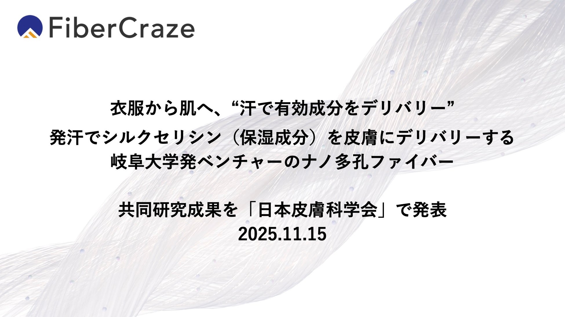FiberCraze株式会社(本社:岐阜市、以下ファイバークレーズ)は、同社の開発したナノ多孔ファイバーCraze-tex®にシルクセリシン(以下、セリシン)を内包し、着用時の汗によりセリシンが皮膚表面に徐放、移動することを実証しました。これは、明星大学、株式会社クリメイト(本社:岐阜県関市)、新潟県工業技術総合研究所と共同研究によるもので、成果は2025年11月15日「第89回日本皮膚科学会東京支部学術大会」にて発表しました。その要点をご紹介いたします。