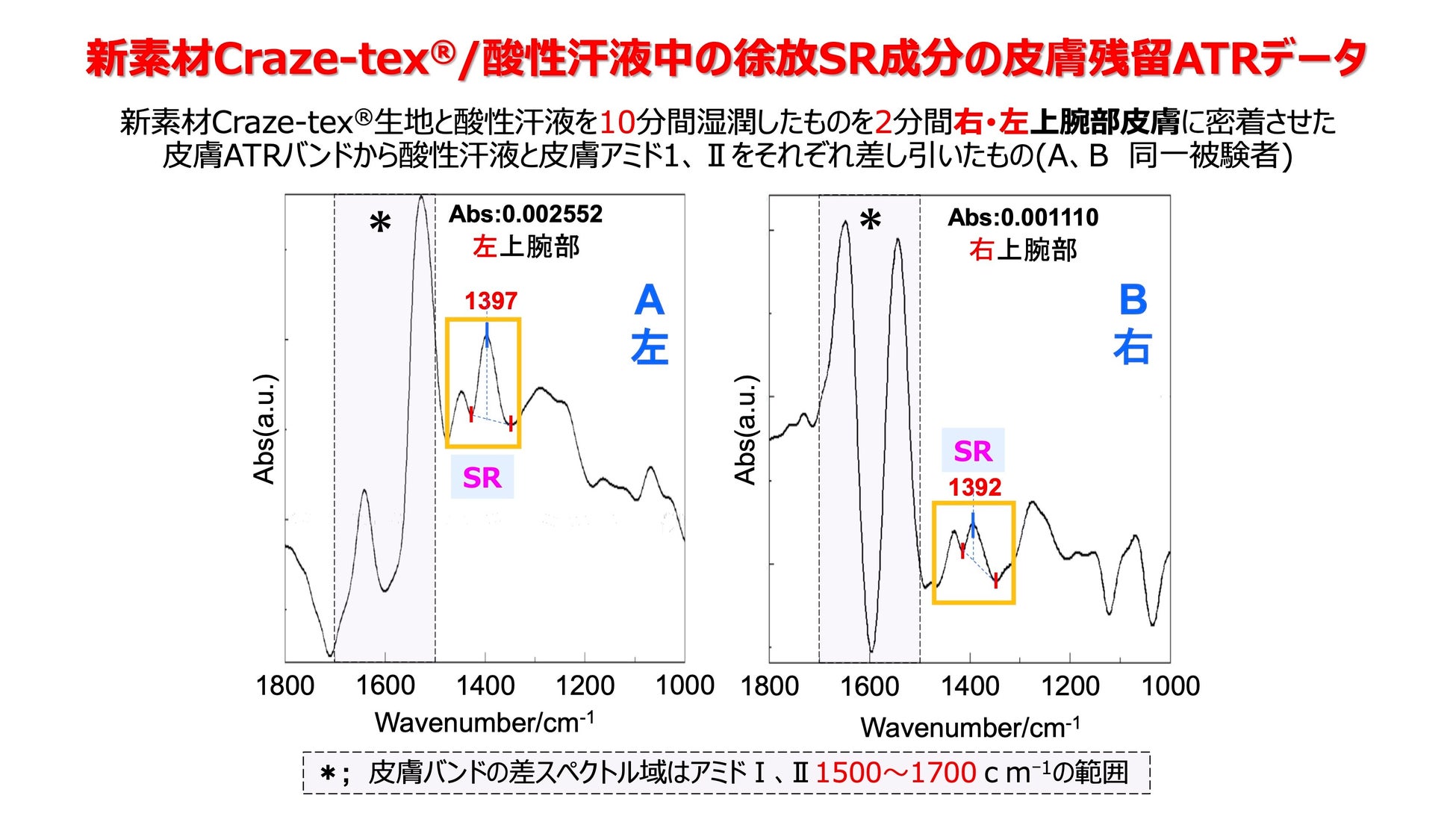 上腕皮膚を整えた後、30mm角のCraze-tex®生地を酸性人工汗液(pH5.6、1000µL)で湿潤して2分間貼布しました。貼布直後から経時にて皮膚部位のATR-FTIRスペクトルを取得し、アミドI/II並びに水分を差引処理後、1398cm⁻¹付近のセリシン由来バンドを定量指標として評価しました。並行して、角層水分・皮膚温・皮膚pHの変化も短時間モニタリングしています。