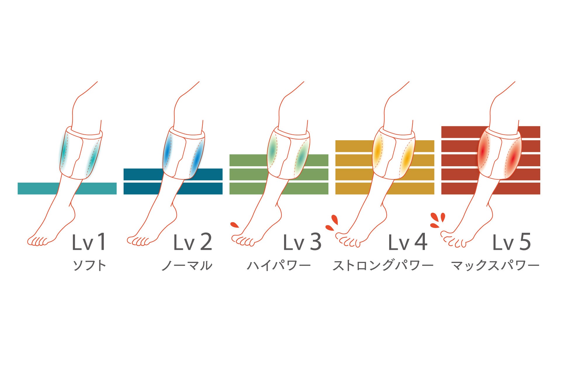 ・ソフトからマックスパワーまで、自由に選べる5段階レベル調整。
