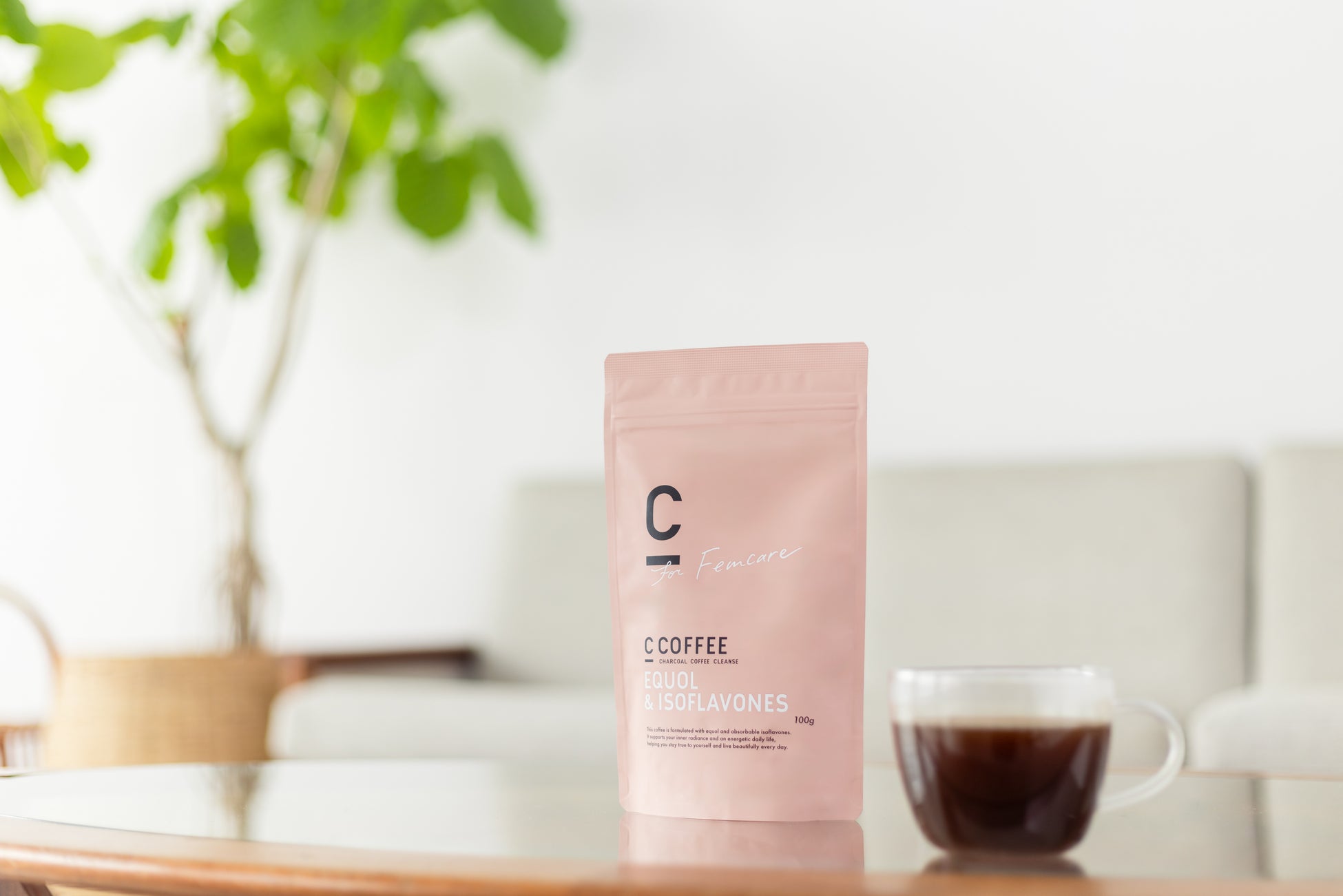 風味と味わいに優れたアラビカ種を100%使用し、カフェインの摂取量を気にする方にも選びやすい、カフェインレスのコーヒーをベースに、大豆由来成分の「エクオール」と「イソフラボン」、Cシリーズお馴染みの炭も配合したコーヒー。