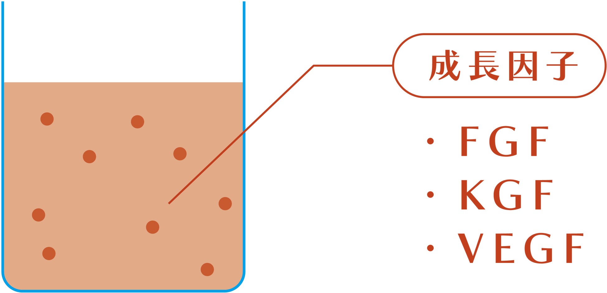幹細胞培養上清液に含まれる有効成分は、成長因子(EGF、FGF、VEGF など)やサイトカイン、エクソソームといった生理活性物質です。成長因子は、細胞の増殖や分化を制するたんぱく質であると言われています。