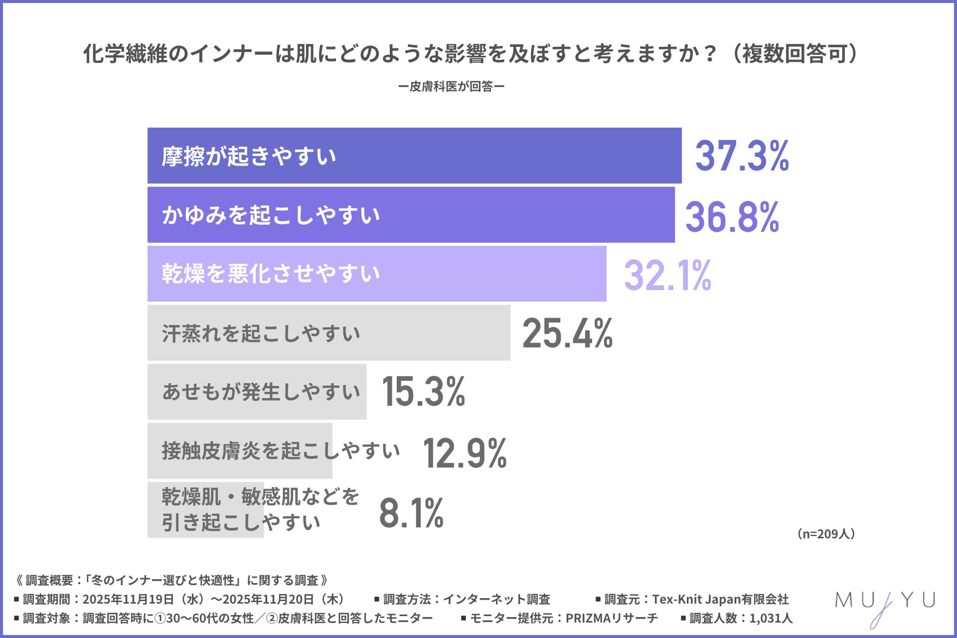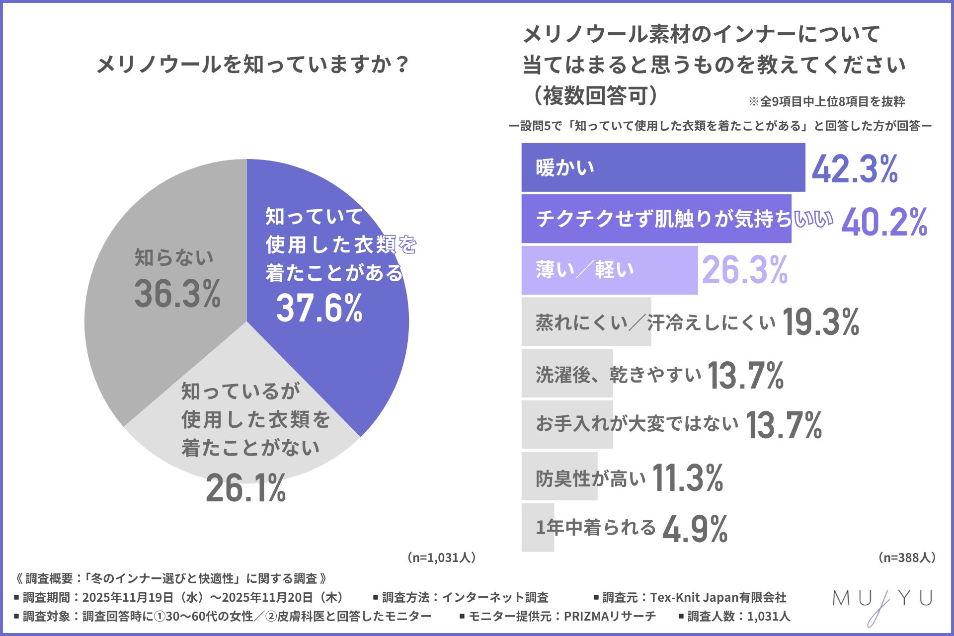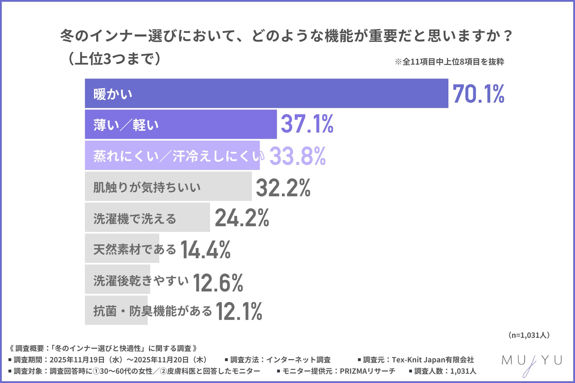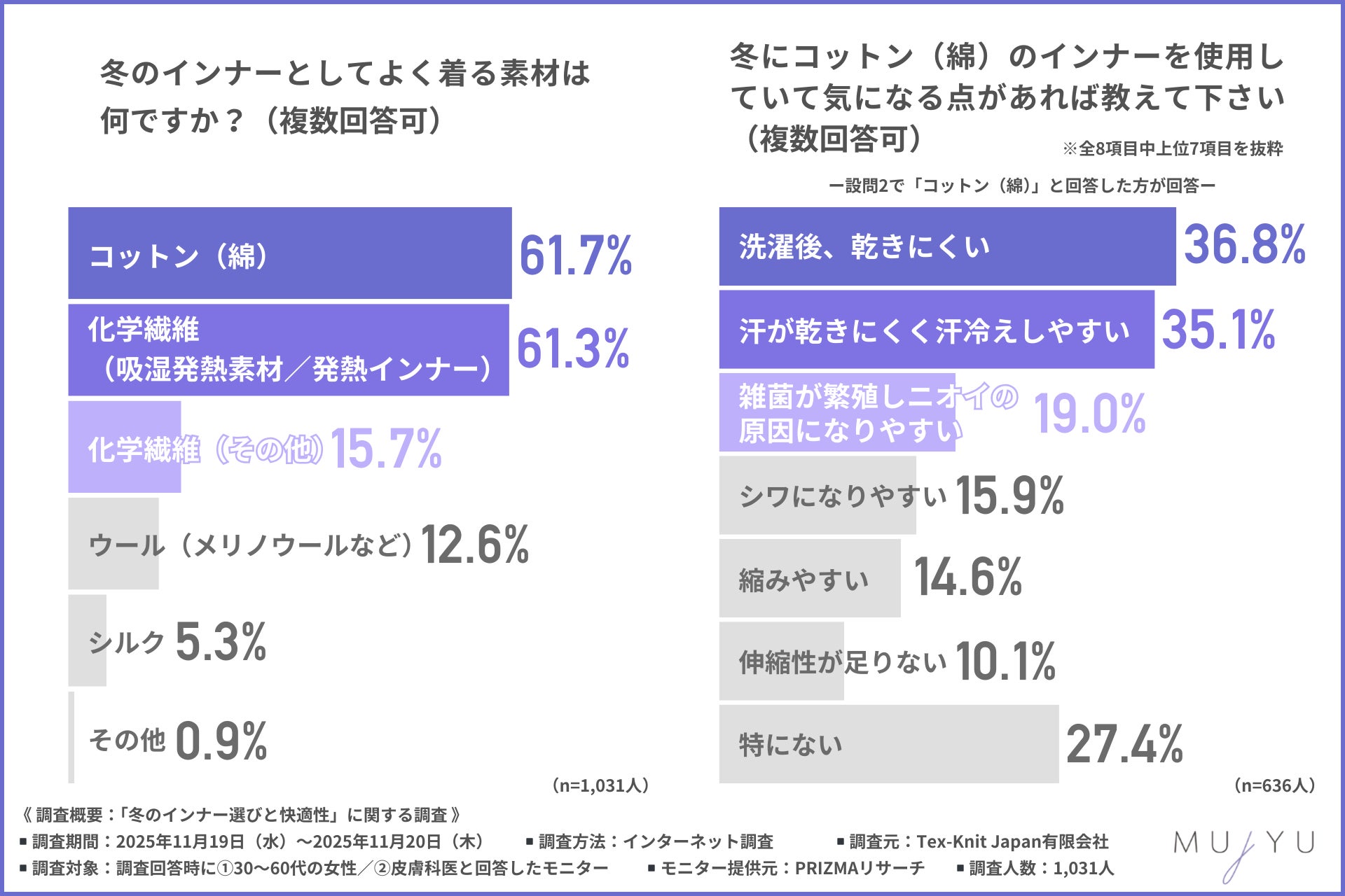 そこで今回、素材にこだわったインナーブランド『MUjYU』を展開するTex-Knit Japan有限会社(https://mujyu.jp/)は、①30~60代の女性/②皮膚科医を対象に「冬のインナー選びと快適性」に関する調査を行いました。